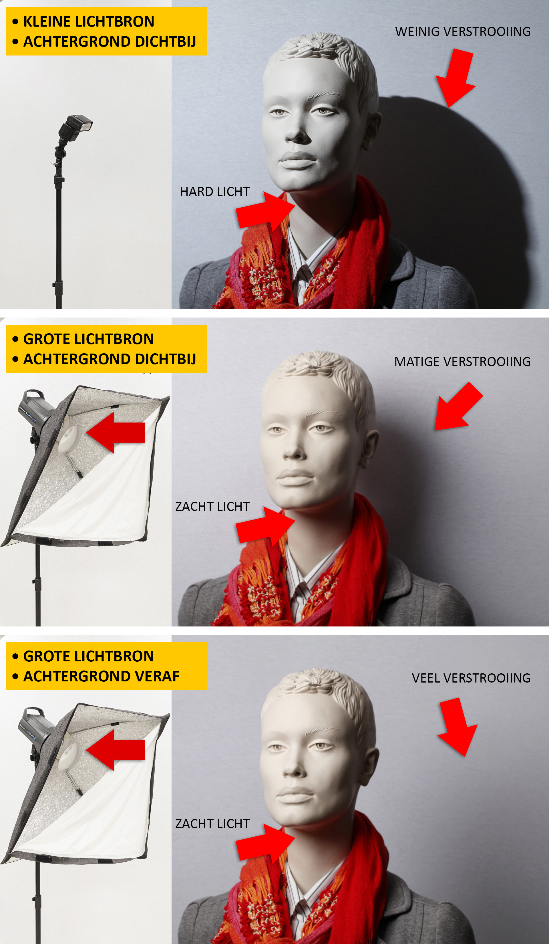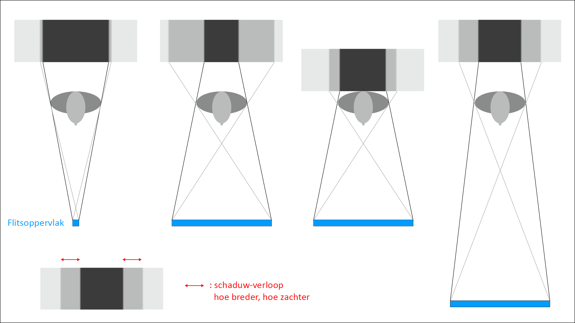 Als we het over zacht licht hebben, dan wil je dat bij geleidelijke vormen de overgangen tussen licht en donker redelijk vloeiend zijn. Dus zonder harde schaduwlijnen. Of die overgangen vloeiend zijn, wordt eigenlijk alleen bepaald door de grootte van de lichtbron in relatie tot de afstand van het licht tot het onderwerp. De illustratie hieronder laat zien hoe de grootte van de lichtbron en de afstand van de camera tot het onderwerp de zachtheid van de overgangen bepalen. De afstand tussen model en achtergrond bepaalt de verstrooiing van de schaduw op de achtergrond.