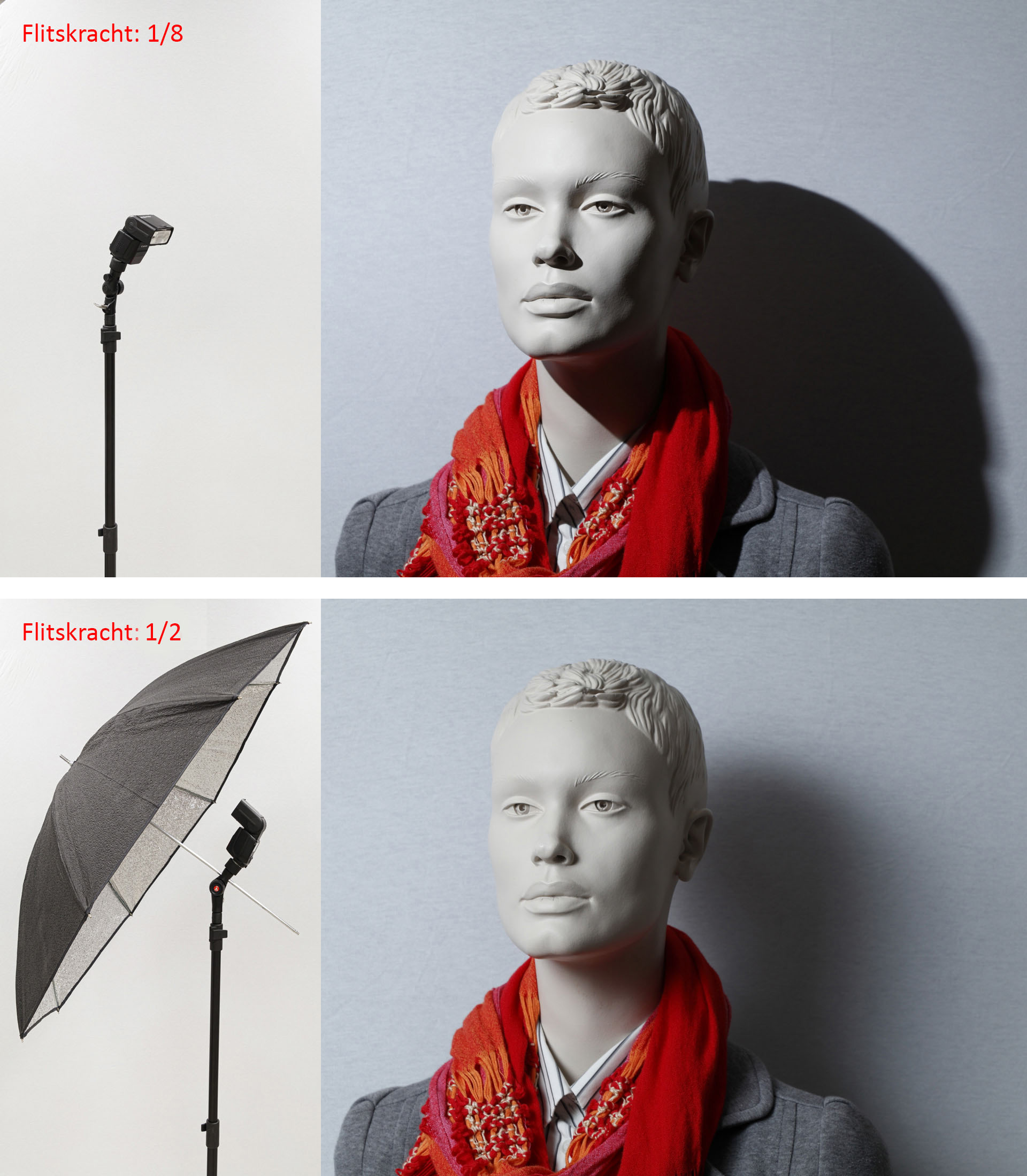 Tip Wil je licht van een Speedlite in de studio zachter maken, dan doe je niet met een flitskapje (alleen meer invul door verstrooid licht), maar gebruik dan een paraplu. Wil je het licht van een softbox groter maken, flits dan indirect tegen een grote witte plaat. |