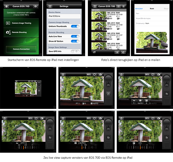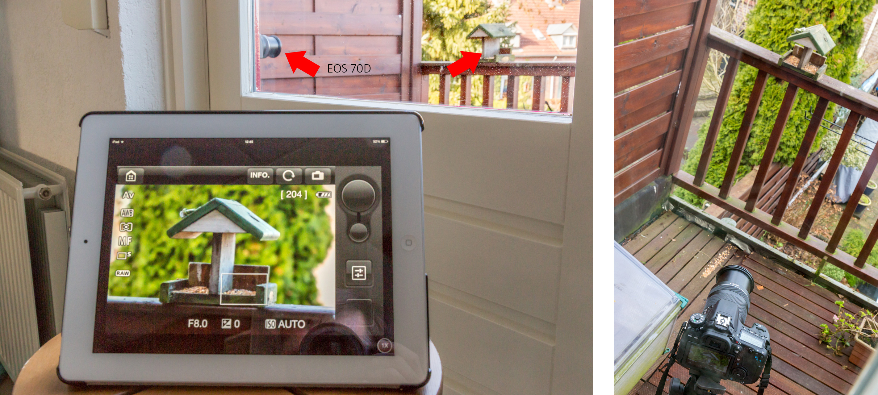 Natuurlijk hebben we vorig jaar al EOS Remote getest in de studio en het werkt dan prima om draadloos én met zicht op het onderwerp foto's te maken. Maar hoe houdt de wifi-setup van de EOS 70D met een tablet zich als we van binnen uit, buiten een vogeltje op afstand willen fotograferen? We hebben daarom op ons dakterras een EOS 70D met een EF-S 18-135mm STM op statief opgesteld en gekaderd op een voederhuisje met daarin wat vogelzaad en broodkruimeltjes. De camera staat in de Av-stand op f/8 met Auto ISO zonder belichtingscompensatie. We hebben handmatig scherpgesteld op het midden van het voederhuisje. Het piepje van de AF hebben we uitgezet. Voor de zekerheid hebben we de Stille sluiter geactiveerd, hoewel dit in live-view niet echt veel effect heeft.