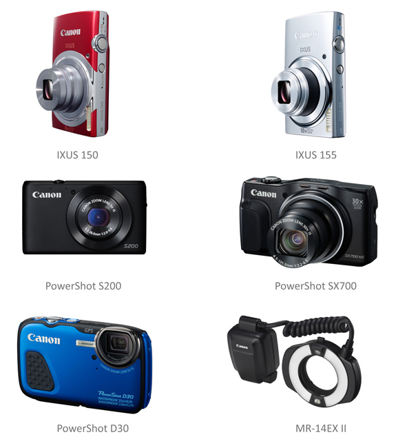 In de nieuwe collectie wordt het DSLR-assortiment vertegenwoordigd door de EOS 1200D. De camera wordt tegelijk geïntroduceerd met een nieuwe EOS Companion app; deze DSLR op instapniveau en smartphone app maken het voor iedereen gemakkelijk om de eerste stap in DSLR-fotografie te zetten. Vier nieuwe modellen maken vanaf nu deel uit van het PowerShot-assortiment: de PowerShot GI X Mark II biedt DSLR-prestaties in een compacte body; de PowerShot SX700 HS is Canon's dunste compactcamera ooit met 30x optische zoom; de robuuste en waterdichte PowerShot D30, en de laatste aanwinst binnen de PowerShot S-serie is de PowerShot S200. Drie nieuwe IXUS-modellen – de IXUS 155, IXUS 150 en IXUS 145 – stellen gebruikers in staat geheel in IXUS-stijl schitterende foto's te maken. De Macro Ring Lite MR-14EX II, een nieuwe flitser voor professionals en enthousiaste fotografen die zich richten op macrofotografie, maakt deze collectie compleet.