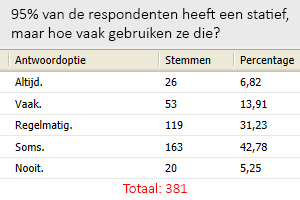 Het resultaat is weer een mooi Gauss-verdeling geworden tussen Altijd en Nooit. De piek ligt daar ergens tussenin en dat is niet onverwacht. Omdat de winnaar Soms geworden is, verwachten we dat gemiddeld in 2 van de 10 gevallen een fotograaf naar een statief grijpt. Ben je op reportage of op reis, dan heb je geen statief bij, terwijl bij een macro- of landschapsfotograaf een statief tot de standaarduitrusting behoort.