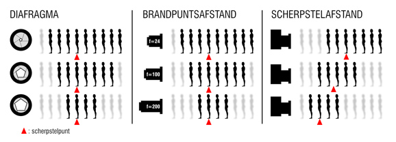 • Bedenk dat bij een kleine scherptediepte de verdeling van de scherpte 50% voor en 50% achter het scherpstelpunt en niet 33/67, zoals bij grotere scherptedieptes.