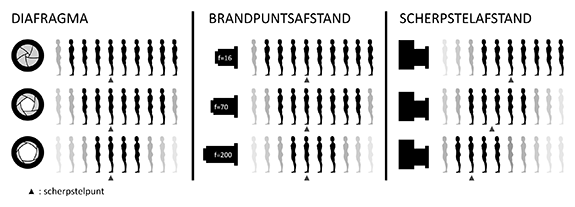 De drie factoren die een rol spelen bij de scherptediepte: diafragma, brandpunt en scherpstelafstand.