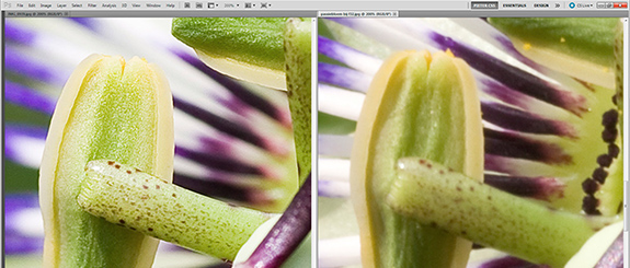 Bovenbeschreven methode geeft u als gebruiker de meeste controle over het eindresultaat, maar het vraagt een behoorlijke vaardigheid in een fotobewerkingsprogramma en ook veel tijd. Wilt u sneller, gemakkelijker en soms zelfs beter ‘focus stacken’, dan kunt u gebruik maken van een automatische functionaliteit in Photoshop CC. Dit programma is echter behoorlijk prijzig in aanschaf en als u alleen maar wilt Focus stacken, dan kunt u misschien beter een beroep doen op speciale ‘stapel’-software. De bekendste is Helicon Focus (shareware, $115) te vinden op www.heliconsoft.com. Dit programma hebben we gebruikt om close-upfoto’s (5x 12 Mp) van een passiebloem samen te voegen. Na installatie, openen van de foto’s, een klik op de knop Run en twee minuten wachten (standaard pc) krijgen we een naadloos en superscherp resultaat voorgetoverd, met de scherptediepte perfect goed tussen het achterste en voorste scherpstelpunt. De achtergrond is nog steeds vaag en het hoofdonderwerp spat haast letterlijk van het scherm. Het programma kan zelfs uit de voeten met RAW-bestanden voor een nog grotere detailweergave.
