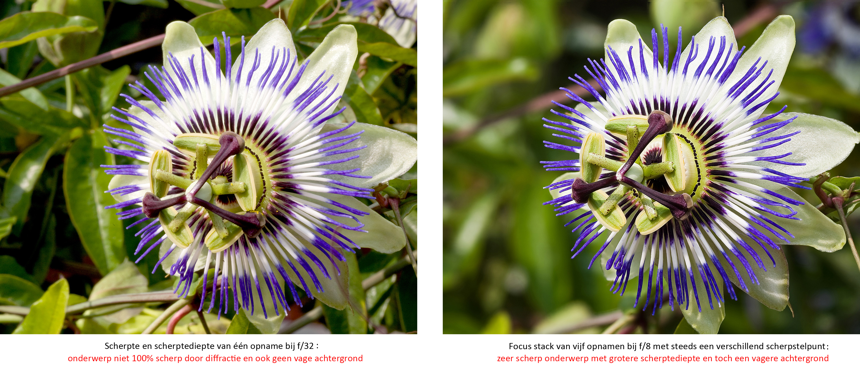 Het grote voordeel van focus stacking is dus dat de scherptediepte onbeperkt kan worden uitgebreid, wat zelfs met de kleinste diafragma’s (f/45) niet mogelijk is. Bij een systeemcamera is de lens het scherpst tussen f/5,6 en f/8 en zijn andere lensafwijkingen minimaal. Bij f/11 of kleiner wordt deze optische scherpte steeds minder (diffractie). Ook wordt door het maken van een scherpsteltrapje bij f/8 vermeden dat door extreem kleine diafragma’s de sluitertijd relatief lang wordt, zodat er een grote kans ontstaat op onscherpte door beweging van de camera, maar vooral van het onderwerp. Hebt u bij f/8 een sluitertijd van 1/125s, dan wordt dat bij f/45 maar liefst vijf stops langer (1/4s) en alles dat maar enigszins beweegt zal dan onscherp zijn. We zouden bij hogere ISO’s kunnen gaan werken om de sluitertijd weer korter te maken, maar dit zorgt voor meer ruis, dus een slechtere beeldkwaliteit. Verder blijft bij Focus stacking van foto’s genomen met f/8 de achtergrond vaag, terwijl de achtergrond van één foto bij f/45 vaak wel detail gaat bevatten en dus storend is voor het hoofdonderwerp. Een onverwacht, maar niet minder onbelangrijk voordeel van focus stacking van opnamen bij f/8 of groter (bv. f/4) is dat stof op de sensor van een systeemcamera onzichtbaar blijft, wat bij f/16 of kleiner (bv. f/22) anders storend zichtbaar geweest zou zijn.