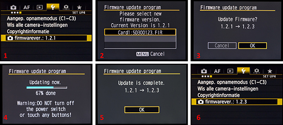 Heb je geen problemen met je camera en ben je niet benieuwd naar eventuele nieuwe functionaliteit op je EOS, laat de firmware op je camera ongemoeid. Ben je wel geïnteresseerd, kijk dan eerst goed in de toelichting op de Canon-site of een update zinvol is en voer dan een firmware-update uit.