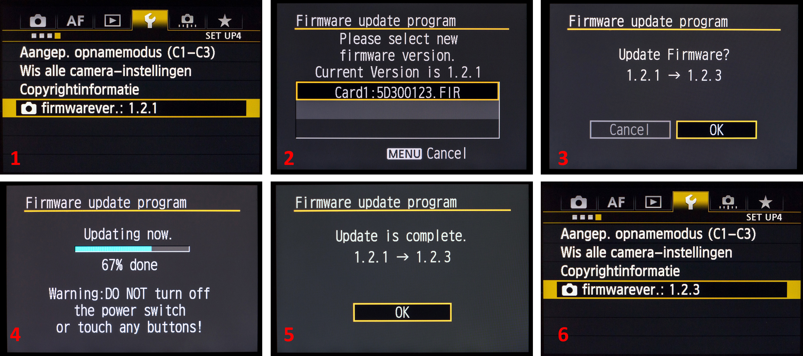 Firmware. Wel eens van gehoord? Je ziet die optie staan in het instelmenu van je EOS camera (gele tabs) en heeft te maken met het besturingssysteem waarmee je camera werkt. Dankzij de firmware heeft de camera bepaalde functionaliteiten en kan ze bepaalde taken uitvoeren. Normaal gesproken is de firmware 100% in orde als je een EOS nieuw koopt, maar zitten er kleine bugs in de camera of wil de fabrikant functionaliteit toevoegen, dan wordt er een nieuwe firmware-versie uitgebracht. In dit artikel hoe je die firmware eventueel kunt updaten.