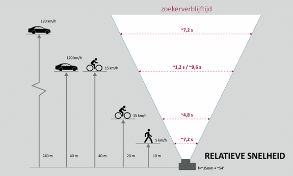 Als je de sluitertijd dus koppelt aan beweging van de camera, dan spreek je in de praktijk bij brandpunten tot 200mm en mét IS - zonder rekensommetjes - over een lange sluitertijd als deze langer wordt dan 1/50s. Beweegt het onderwerp, dan gelden echter heel andere criteria dan de brandpunt-sluitertijdregel en is de kritische sluitertijd gerelateerd aan de snelheid, afstand en richting van het hoofdonderwerp. Snelheid en afstand zijn daarbij interessante parameters. Een hond die op 3 meter langs rent, beweegt in absolute zin langzamer dan een straaljager op 3 km afstand, maar je zult echter toch een kortere sluitertijd moeten hanteren om de beweging van dit huisdier te bevriezen dan bij de straaljager. De hond beweegt op die korte afstand namelijk relatief sneller dan de straaljager op grote afstand. Voor het bevriezen van een bewegend onderwerp met een ‘korte’ sluitertijd is dus de relatieve snelheid belangrijk en die kunnen we eenvoudig koppelen aan de tijd die het voorwerp nodig heeft om van links naar rechts door de zoeker te gaan. In de onderstaande afbeelding wordt de invloed van absolute snelheid en afstand tot de camera geïllustreerd. Daarin wordt duidelijk dat bij toename van de afstand de tijd in de zoeker langer wordt en dus de relatieve snelheid korter is. Bij een lagere relatieve snelheid kun je langere sluitertijden gebruiken.
