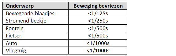 Omdat we niet allemaal een wiskundeknobbel hebben of een rekenmachine bij de hand, is het handiger om gewoon onderstaand lijstje als leidraad voor ‘bevroren beweging’ te nemen. Is dat ook moeilijk om te onthouden, kies dan - als je voldoende belichtingsruimte hebt - altijd 1/1000s of korter, dan staat de meeste beweging stil en scherp op de foto.