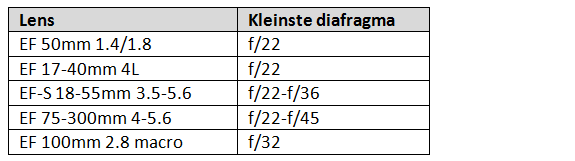 Kleinste diafragma Het kleinste diafragma dat je kunt instellen op een camera wordt bepaald door fysieke aspecten van een lens. Over het algemeen gaan zoomlenzen in de telestand tot f/32 en soms ook nog een stop kleiner f/45. In de groothoekstand kan het diafragma vaak niet kleiner worden dan f/22, een stop groter dan f/32. Deze limietwaarden tref je ook bij lenzen met een vast brandpunt: f/22 tot f=100mm en f/32 bij brandpunten vanaf 100mm. Soms haalt een macrolens nog f/32. Bij al deze kleinste diafragma’s is dus het beeld dat op de sensor valt optisch onscherp en is het niet onverstandig deze waarden zoveel mogelijk te vermijden. |