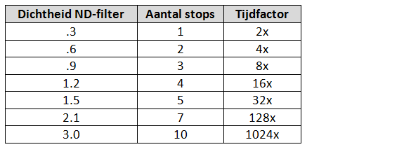 Rekenen Als je een ND-filter gebruikt, dan houdt deze vaak zoveel licht tegen dat je door de oogzoeker van een DSLR het onderwerp moeilijk kunt kaderen en dat de camera niet meer automatisch kan focussen en lichtmeten. Kaderen, scherpstellen en belichten moet je dus doen als het filter nog niet voor de lens geplaatst is. Stel zonder ND-filter handmatig scherp (AF op lens uitzetten) en bepaal de belichting in de M-stand. Schroef dan het ND-filter op en vermenigvuldig de sluitertijd met de dichtheidsfactor van het ND-filter. Dus bij een .9 ND (3 stops), dus een factor 8 (2^3), praktisch dus 10x. Een 1/2s zonder ND-filter wordt dan 5s met filter. Hiervan zie je hieronder een overzichtje en heb je dat niet paraat, download dan een app voor je telefoon, zodat het je altijd bij de hand hebt |