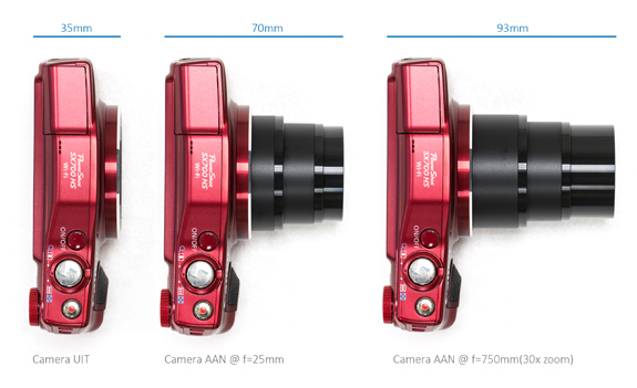 Als je naar het ontwerp van de SX200-serie (feb. 2009) kijkt, dan zie je duidelijke verschillen tussen de opeenvolgende modellen. Hoewel die uiterlijk soms groot lijken, zijn ze toch veelal cosmetisch en blijft het principe van deze reiscamera’s onaangetast: lichtgewicht, zakformaat en veel optische zoom. En dat maakt de evolutie van de SX200-serie toch wel bijzonder. Want een lens die 12x kan zoomen (SX200, 28-336mm) of een model dat 30x optisch zoom heeft (SX700, 25-750mm), dat heeft grote invloed op de constructie van de lens. Vergelijk dat maar eens met een EF 300mm en een EF 800mm, die laatste is ook veel groter en zwaarder. Dus hoe meer zoom, des te groter de lens zou moeten worden. Bij de PowerShot SX700 is Canon er echter in geslaagd om een lens met 30x optische zoom van 25mm tot 750mm in een camera te stoppen, die in de UIT-stand slechts 35mm dik (of liever: dun) is en maar 20 gram zwaarder is dan het eerste model met 'slechts' 12x zoom. De camera past dus nog steeds in een (ruime) broekzak en zal nooit tot last zijn. Helemaal ingezoomd wordt de PowerShot SX700 niet ‘dikker’ dan 93mm.