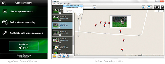 Toegevoegd is wel wifi. Verbinding met je smartphone of tablet is simpel en met de gratis app Canon Camera Window, kun je dan overal draadloos de foto’s op de camera bekijken en zelfs draadloos foto’s maken vanaf je telefoon of tablet (Remote shooting). Het is zelfs mogelijk om met deze app de GPS-gegevens van je telefoon te koppelen aan de foto’s op je telefoon. Je verbindt daartoe camera en telefoon via wifi en start een zogeheten ‘Location Log’. Daarna kun je gaan fotograferen zonder dat de twee apparaten verbonden zijn. Kom je dan terug thuis, dan verbind je ze weer en tik je in Camera Window op de optie Add locations en de foto’s op de camera worden voorzien van coördinaten. De nauwkeurigheid is echter niet altijd even hoog. Met Lightroom 5 of Canon’s Map Utility kun je vervolgens de foto’s op de kaart zien. In dat laatste programma kun je ze ook exporteren naar Google Earth.