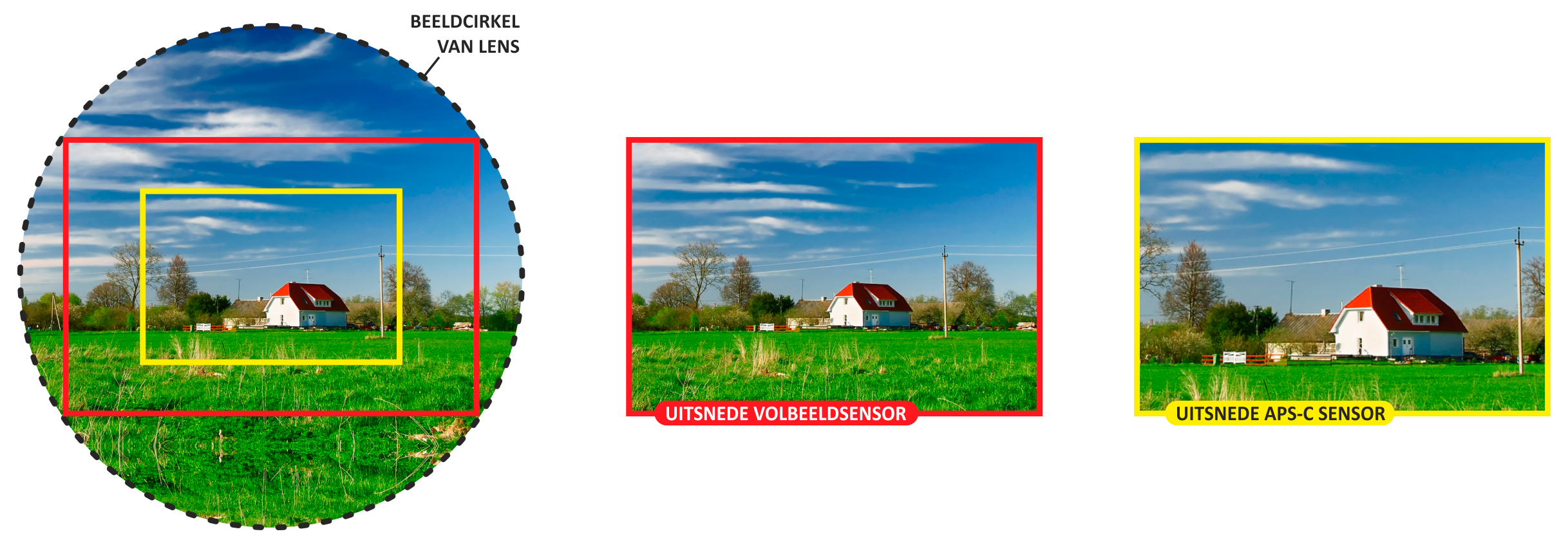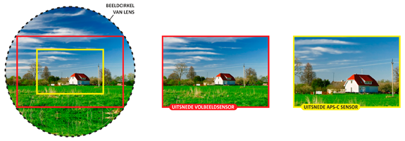 De meeste spiegelreflexcamera’s voor consument en semi-gevorderd, dus ook veel EOS-modellen, zijn voorzien van een APS-C sensor. Deze heeft een formaat van 22,5mm bij 15mm en dat is beduidend kleiner dan van een volbeeld sensor, die zo groot is al een kleinbeelddia (36 x 24mm). Het kleinere sensorformaat van APS-C maakt dus ook een kleinere uitsnede uit de beeldcirkel van een lens en het lijkt daarom alsof je bent ingezoomd. Dus bij een lens met een brandpunt van 200mm zie je op een APS-C camera - bijvoorbeeld een EOS 70D - hetzelfde kader (=beeldhoek) als met een lens met brandpunt 320mm op een volbeeldcamera, zoals de EOS 6D. Je ‘zoomt’ dus een factor 1,6x verder in zonder verlies van beeldkwaliteit. Voor macro-, natuur-, portret- en vogelfotografie is dit een welkome bijkomstigheid van de kleinere sensor.