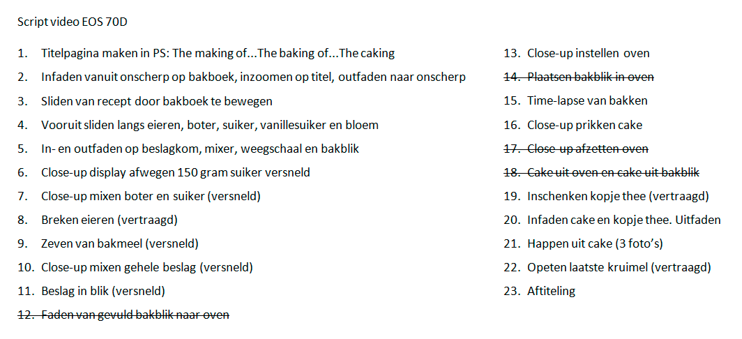 We hebben dus een lijstje gemaakt met scènes die we achter elkaar willen zetten. Meestal is dat chronologisch. Dat hoeft echter niet te betekenen dat je alle clips ook chronologisch opneemt. Soms is het handiger om alle scènes op een bepaalde locatie of met een bepaalde acteur gelijktijdig op te nemen. In het geval van ons cake-projectje hebben we het redelijk chronologisch opgenomen, al hebben we het instellen van de oven en het prikken in de cake pas achteraf gedaan, omdat de opstelling van de time lapse de ruimte voor de oven in beslag nam.