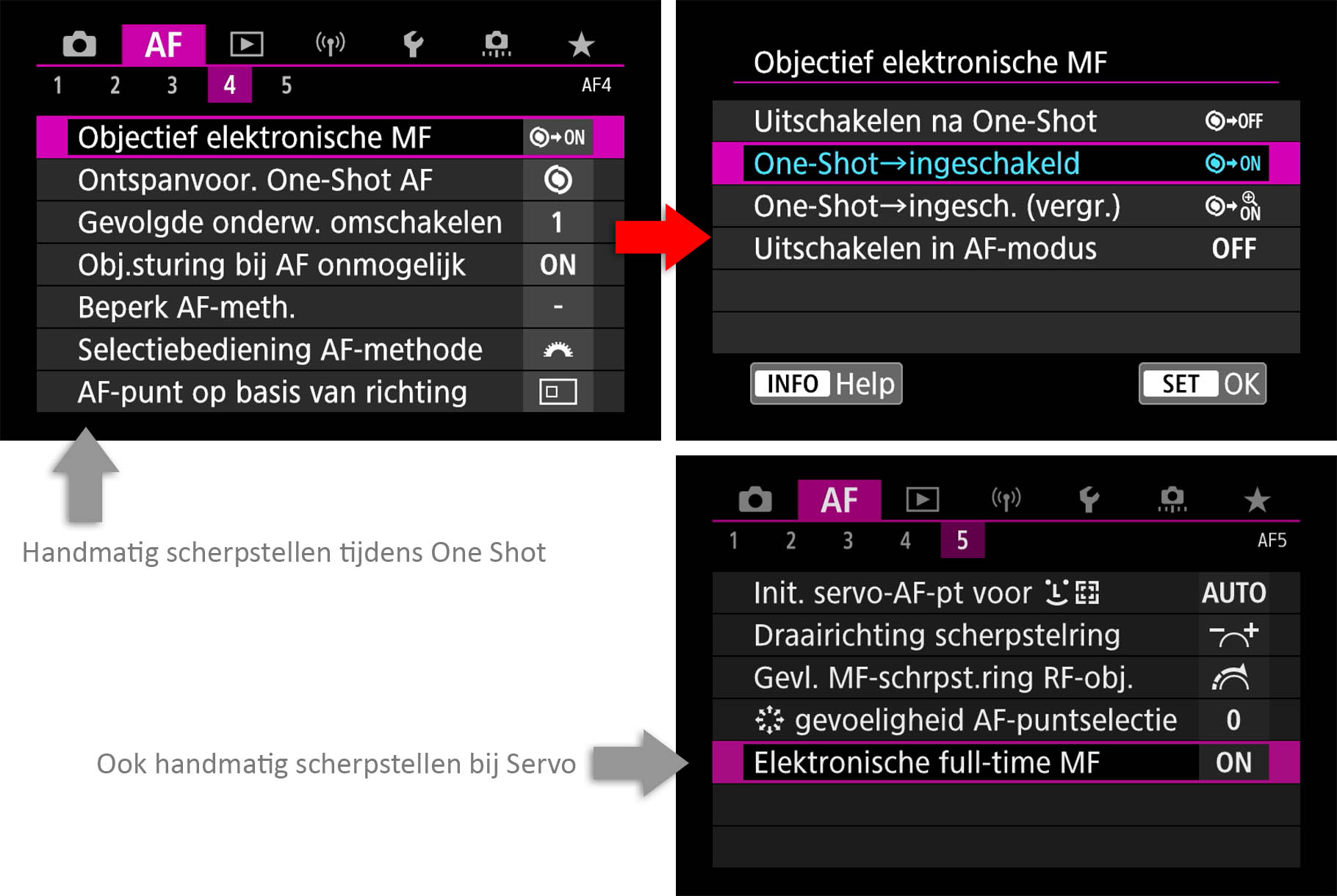FTM nieuw Met versie 1.3.0 van de firmware van de EOS R6 en EOS R5 (maart 2021) heeft Canon de mogelijkheid van handmatig scherpstellen tijdens AF ook geschikt gemaakt in de Servo-modus. In het menu AF5 tref je nu de optie Elektronische full-time manual. Dat lijkt sterk op de mechanische FTM van EF-lenzen, maar heeft dus betrekking op Servo in plaats van Objectief Elektronisch MF wat dan meer betrekking heeft op One Shot. Snap jij het nog? |