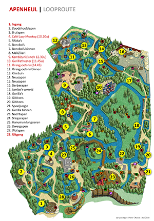 De Apenheul is een prachtig natuurpark met een redelijk dichte begroeiing. Zo hebben alle delen van het park hun eigen intieme beleving, maar is het overzicht bij een eerste bezoek minder duidelijk. Er is daarom een soort looproute in kaart gebracht, zodat je geen onderdeel van de Apenheul hoeft te missen en zodat je weet waar je op een zeker moment bent. Deze route aangevuld met andere nuttige informatie (o.a. tijden van presentaties) wordt bij aankomst overhandigd. Je kunt natuurlijk ook een pdf op je telefoon zetten (download hier), dan heb je de route tijdens je bezoek altijd binnen handbereik.