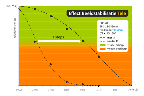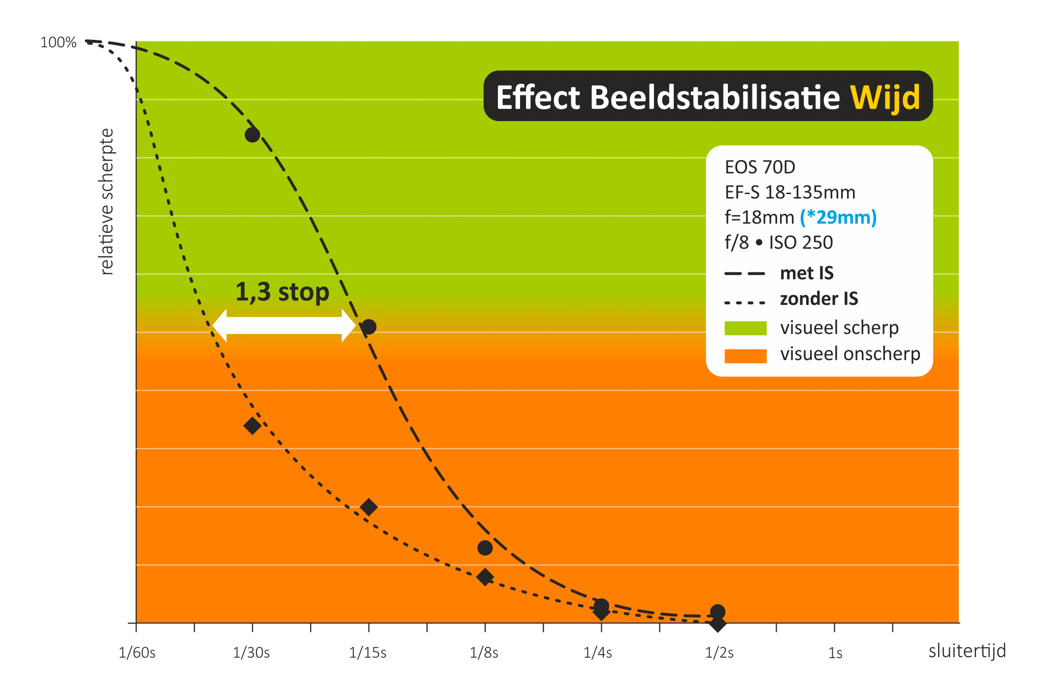 We hebben dus eerst het rendement van de beeldstabilisatie bij een langer brandpunt (tele, 200mm*) bekeken. We zien daarbij dat de onscherpte die we bij 1/200s meten zonder beeldstabilisatie, gelijk is aan de onscherpte bij 1/25s mét IS. Dat is dus een voordeel van drie stops (1/200s - 1/100s - 1/50s - 1/25s) en dat komt praktisch overeen met de specificatie die door Canon wordt opgegeven, zijnde 3 à 4 stops. Dit rendement zien we bij f=135mm zowel bij de EF-S 18-135mm IS STM als bij de EF 70-200mm 2.8L IS II.