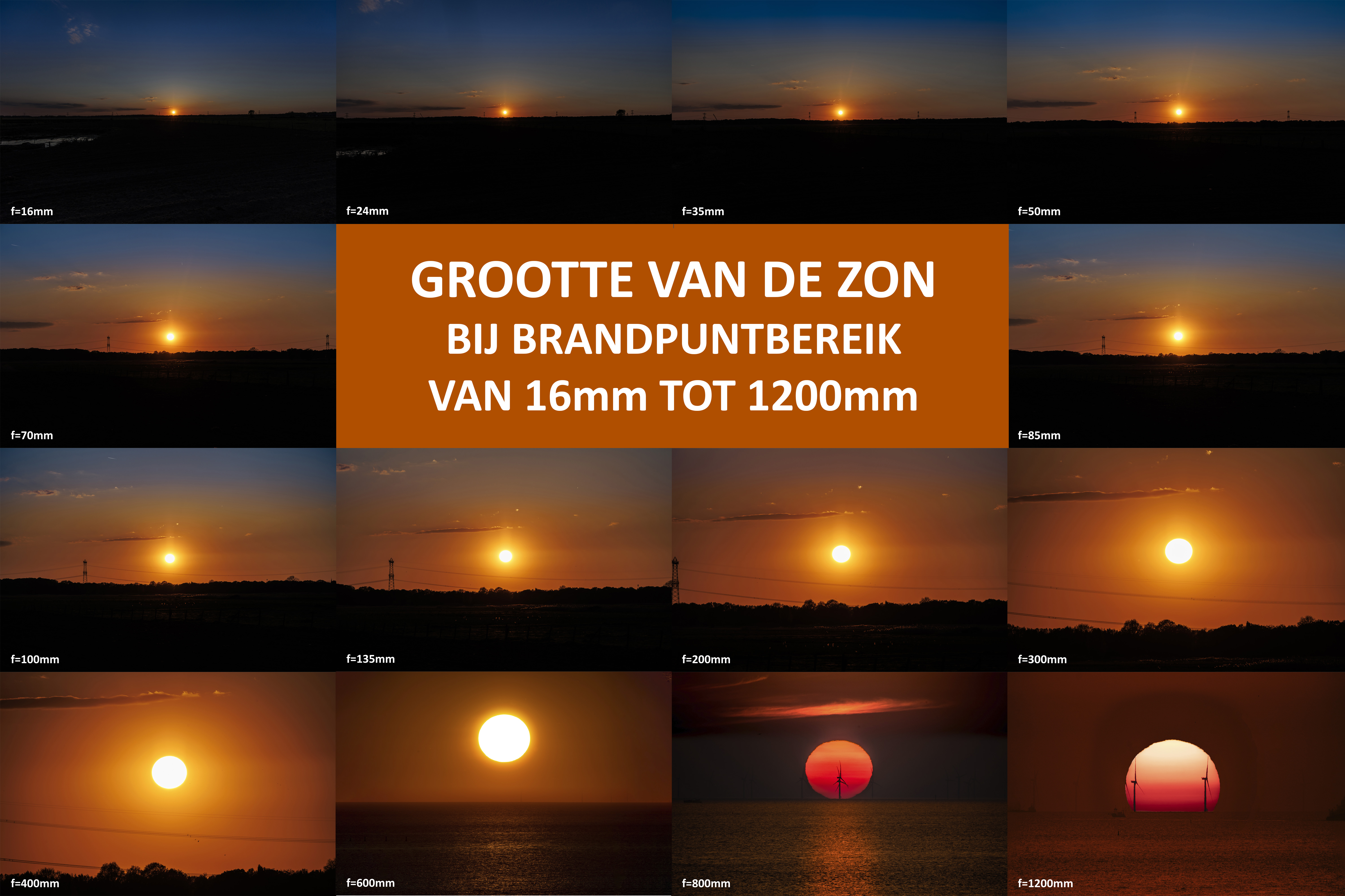 Dat was 100mm, maar meer dan de helft van de antwoorden schatte 24mm. Slechts twee volgers hadden de vraag ‘goed’. Opmerkelijk en voor mij aanleiding om op een andere avond terug te gaan en bij een brandpuntbereik tussen 16mm en 400mm een zonsondergang vast te leggen, zijnde 16, 24, 35, 50, 70, 85, 100, 135, 200, 300 en 400mm. Deze zou ik dan aanvullen met foto’s bij 600mm, 800mm en 1200mm, die ik genomen had tijdens de review van de RF 600mm, RF 800mm en de RF 2.0x extender (klik hier). Het resultaat zie je hieronder.