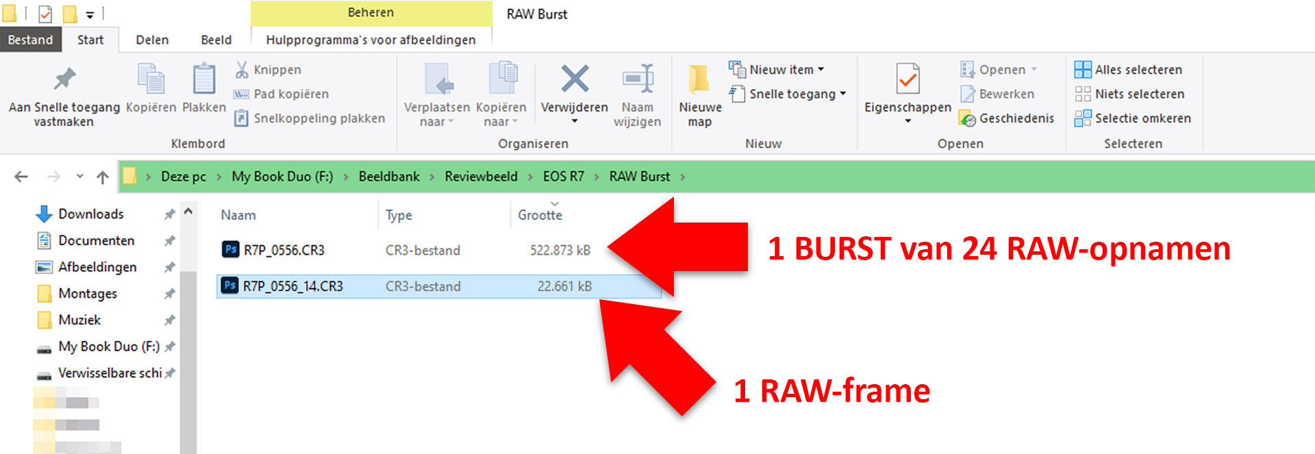 Het resulterende Burst-bestand is dus één cr3-bestand en bij de EOS R7 is dat bestand ongeveer 30x zo groot dan een enkel RAW-bestand, dus circa 550 MB. Je kunt het Burst-bestand op de camera als reeksopname van de losse opnamen terugzien en op die manier ook het ‘beslissende moment’ er als losse RAW-foto uithalen. Dit is ook mogelijk in Digital Photo Professional (DPP 4.16), maar echter niet in Lightroom Classic. Het enkele RAW-bestand kun je dan vervolgens verder bewerken in DPP of Lightroom Classic en omzetten naar JPEG/TIFF.