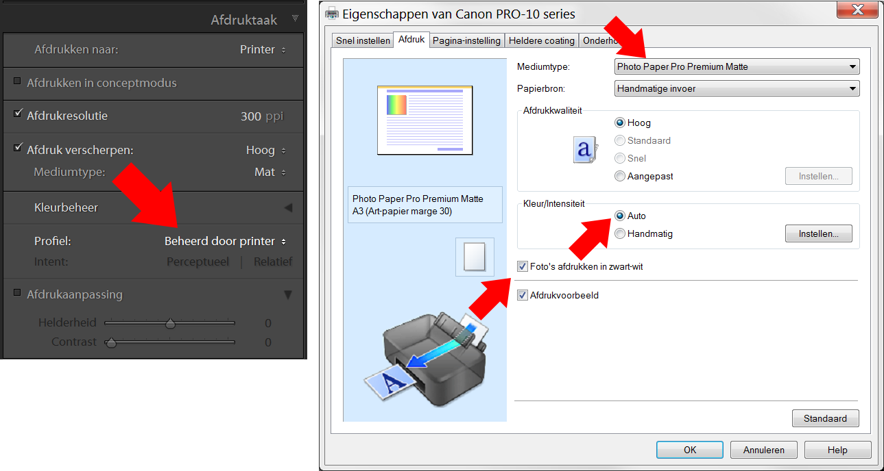 De tweede mogelijkheid om zwart-wit af te drukken vanuit het deelvenster Afdruktaak van Lightroom is door Lightroom de kleuren te laten beheren. Achter de optie Profiel, waar nu nog ‘Beheerd door de printer’ staat, klikken we op deze waarde en dan kunnen we het kleurprofiel kiezen dat bij het papier in de printer past. Dus in ons geval voor Photo Paper Pro Premium Mat. De overige instellingen zoals afdrukresolutie en verscherping, kunnen ongewijzigd blijven. In de driver van de printer moeten we dan nog wel even de kleuromzetting uitzetten.