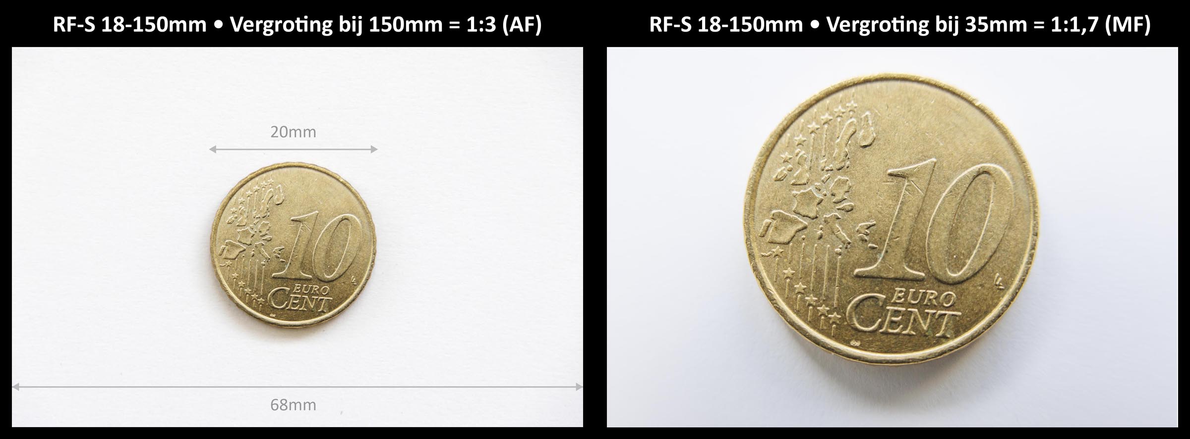 In de autofocus kan bij 150mm scherpgesteld worden tot 45cm. Je hebt dan een behoorlijke vergroting van 1:3 en dat is prima voor close-ups van bloemen en insecten. Je kunt de scherpstelling echter ook handmatig doen en dan kun je dichter bij het onderwerp komen. De grootste vergroting van 1:1,7 krijg je dan bij een brandpunt van 35mm. De frontlens zit dan echter bijna tegen het onderwerp aan, wat moeilijk is voor belichting en nauwkeurigheid.