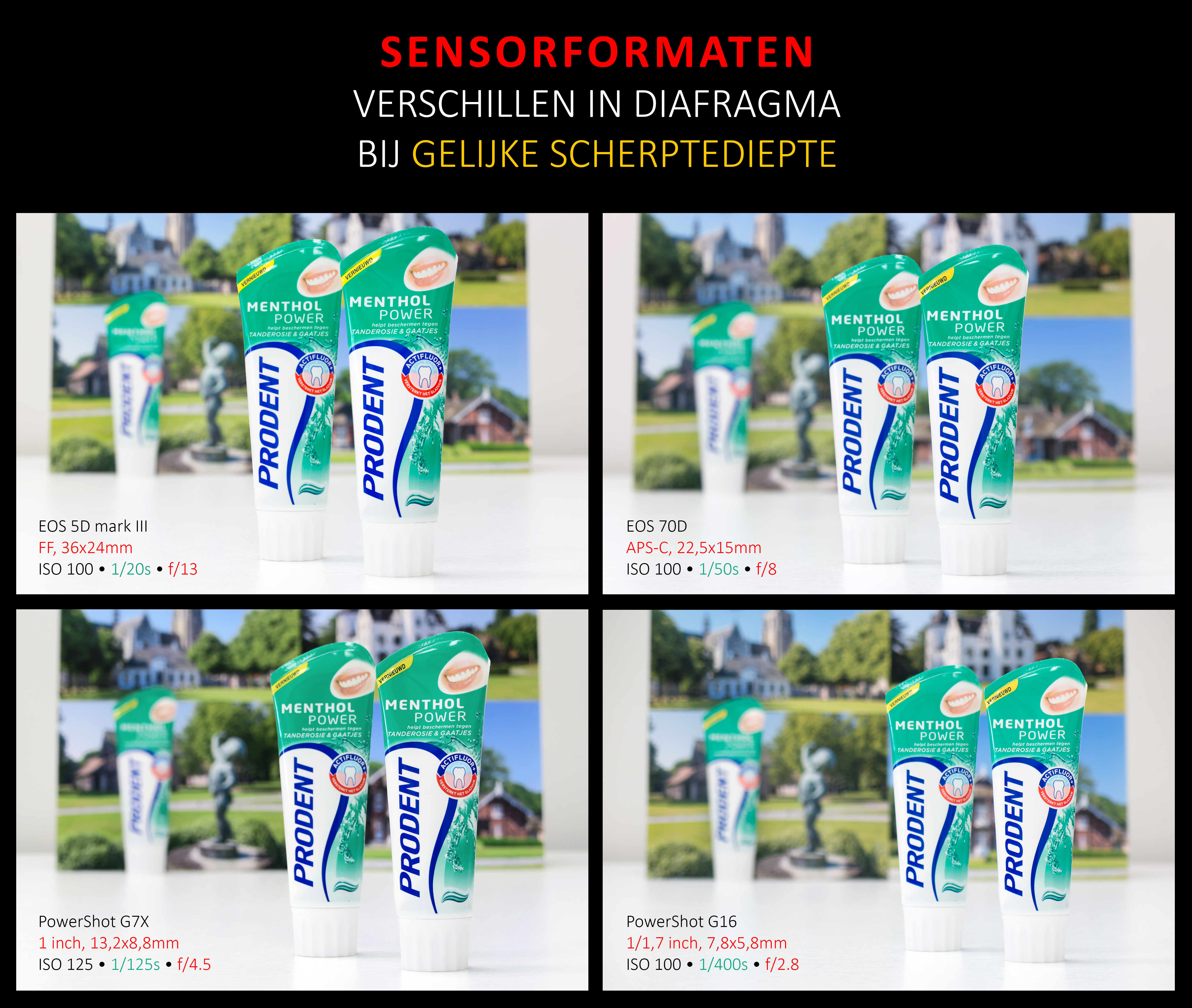 In de onderstaande afbeelding is te zien hoeveel kleiner het diafragma van camera’s met een grotere sensor moet worden om toch dezelfde scherptediepte te krijgen. Let ook op de gevolgen voor de sluitertijd.