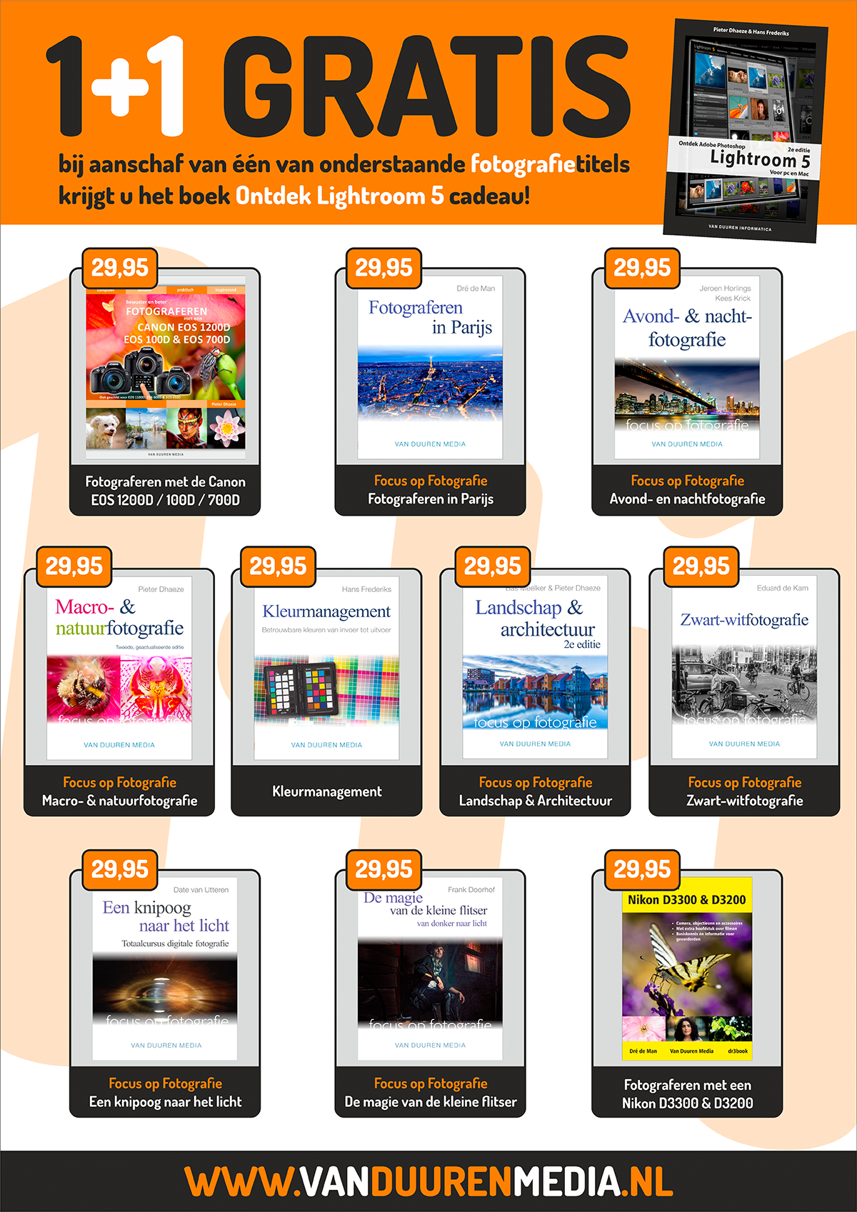 Actie 1+1 gratis! In de maand december ontvangt u bij van Duuren Media bij bepaalde titels het boek Ontdek Lightroom 5, 2e editie cadeau! Met andere woorden: twee boeken voor de prijs van één! Wees er snel bij, want de actie eindigt na 31 december 2014. Klik hier!