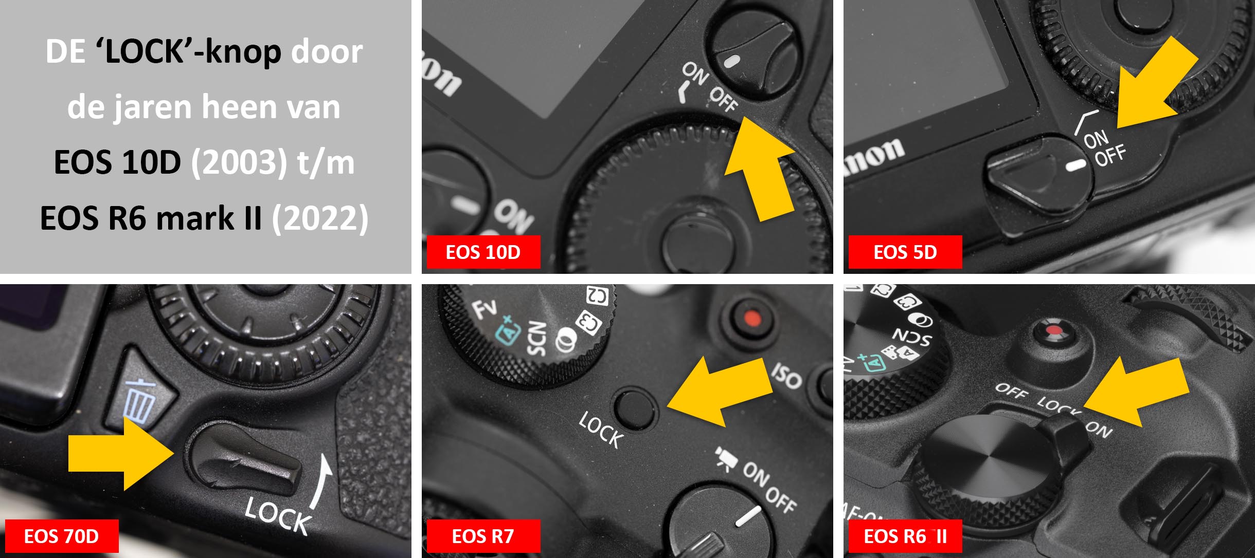 De LOCK-knop op een EOS-camera bestaat al lang. Niet met die benaming en ook steeds in een andere gedaante, maar het is de stand van een schakelaar of van een aparte knop, waarmee de abusievelijke bediening van een instelwiel wordt voorkomen. Bij de EOS 10D was het een aparte schakelaar bij het grote instelwiel aan de achterzijde, waarmee je de functie van dit wiel kon aan- of uitzetten. Daar was geen onduidelijkheid over. Later werd die ‘dedicated’ knop samengevoegd met de aan/uit-schakelaar (EOS 5D) en was de functie van de knop al minder duidelijk. Bij de nieuwste camera’s (EOS R-systeem) is het geen schakelaar meer, maar een knopje met de naam LOCK, waarvan de functionaliteit veel verder gaat dan het aan- of uitzetten van een instelwiel. In de handleiding wordt het dan ook geen LOCK-knop genoemd, maar een knop voor Multifunctievergrendeling, waarmee je naast de twee instelwielen ook de controlring, joystick en aanraakscherm kunt aan/uitzetten.