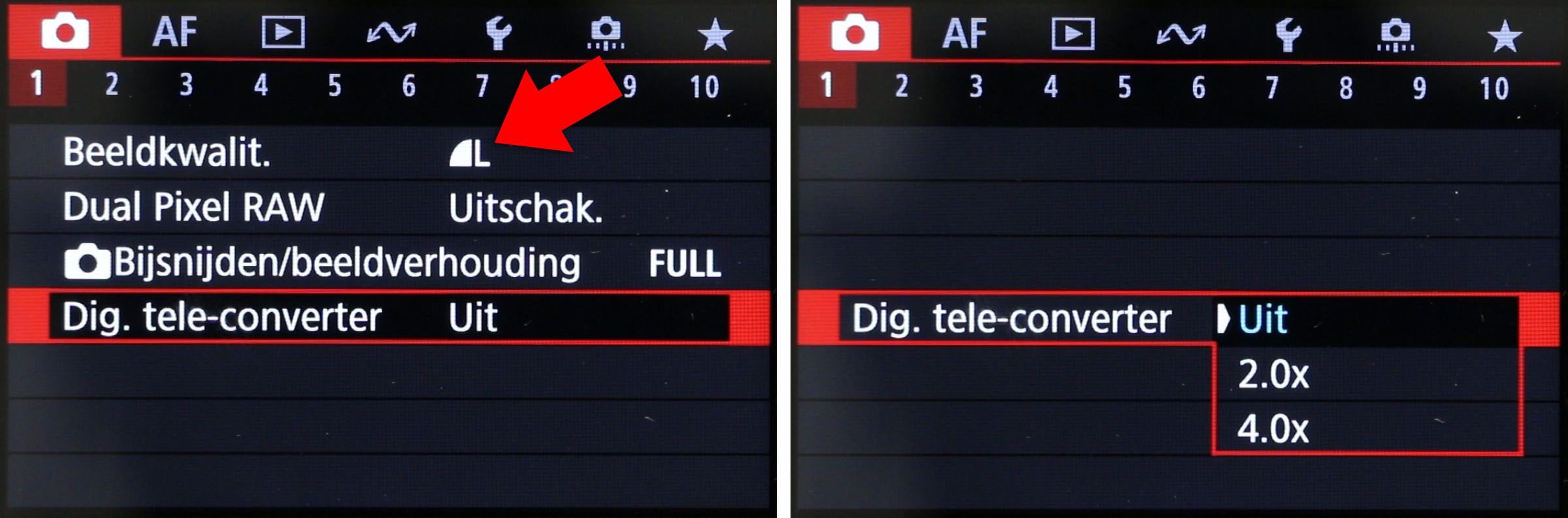 Met de komst van de EOS R6 mark II is er dus nu ook een digitale versie beschikbaar met de factor 2x of 4x. Ook hiermee zie je het onderwerp groter in beeld, maar is dit het resultaat van een uitsnede (crop) uit het originele kader dat digitaal 2x of 4x vergroot is.