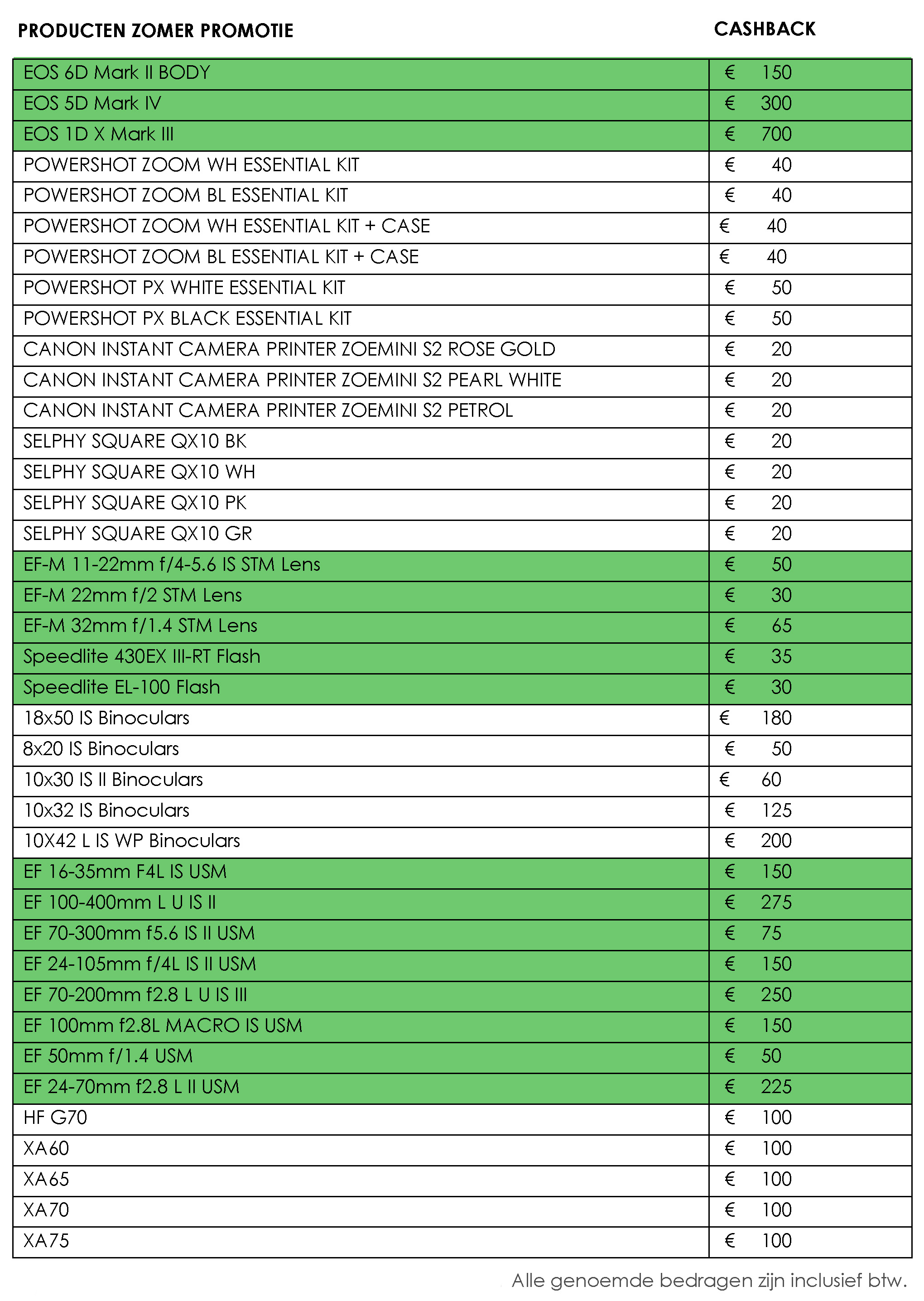 Ook deze zomer (2023) heeft Canon weer een cashback-actie op geselecteerde proudcten. Klik hier voor de voorwaarden en deelname.