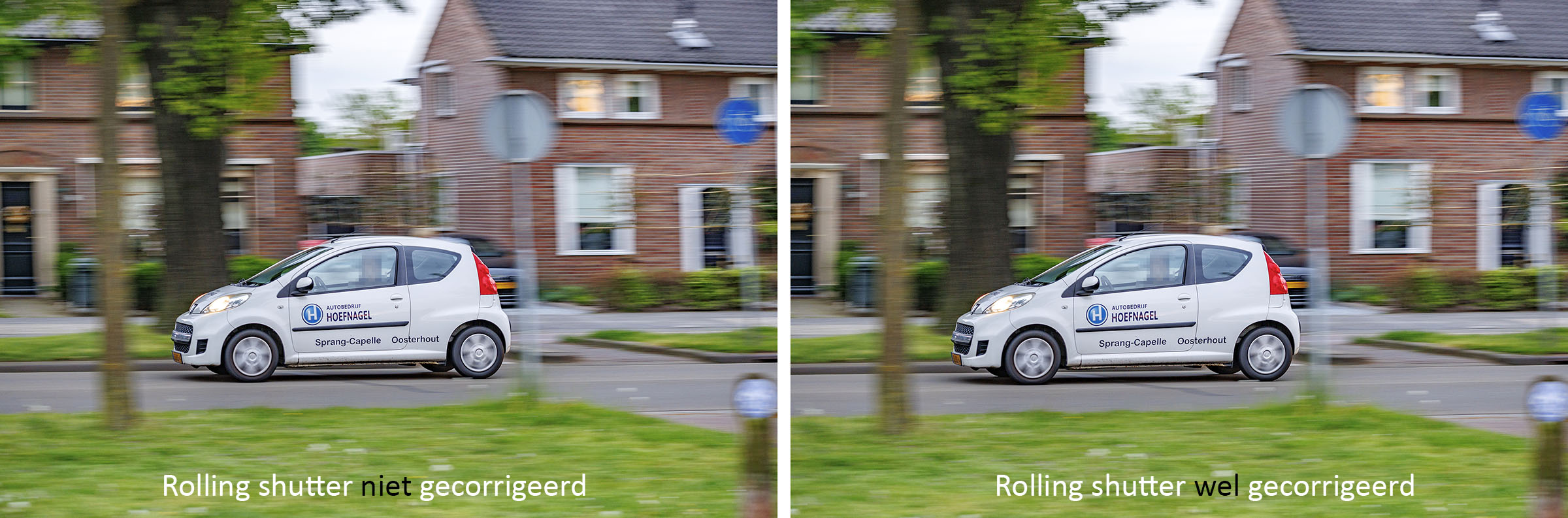 En om maar meteen met de deur in huis te vallen; het is me 100% meegevallen. Bij het snel meetrekken van bewegende voorwerpen zag ik inderdaad een matige ‘rolling shutter’ in de vorm van scheve lijnen in de achtergrond (huizen, bomen, lantaarnpalen, reclameborden), maar die is vaak redelijk eenvoudig te corrigeren (Photoshop: klik hier). De vervorming van de bewegende voorwerpen zelf, zoals bij meetrekken van voertuigen, is minimaal en valt niet op.