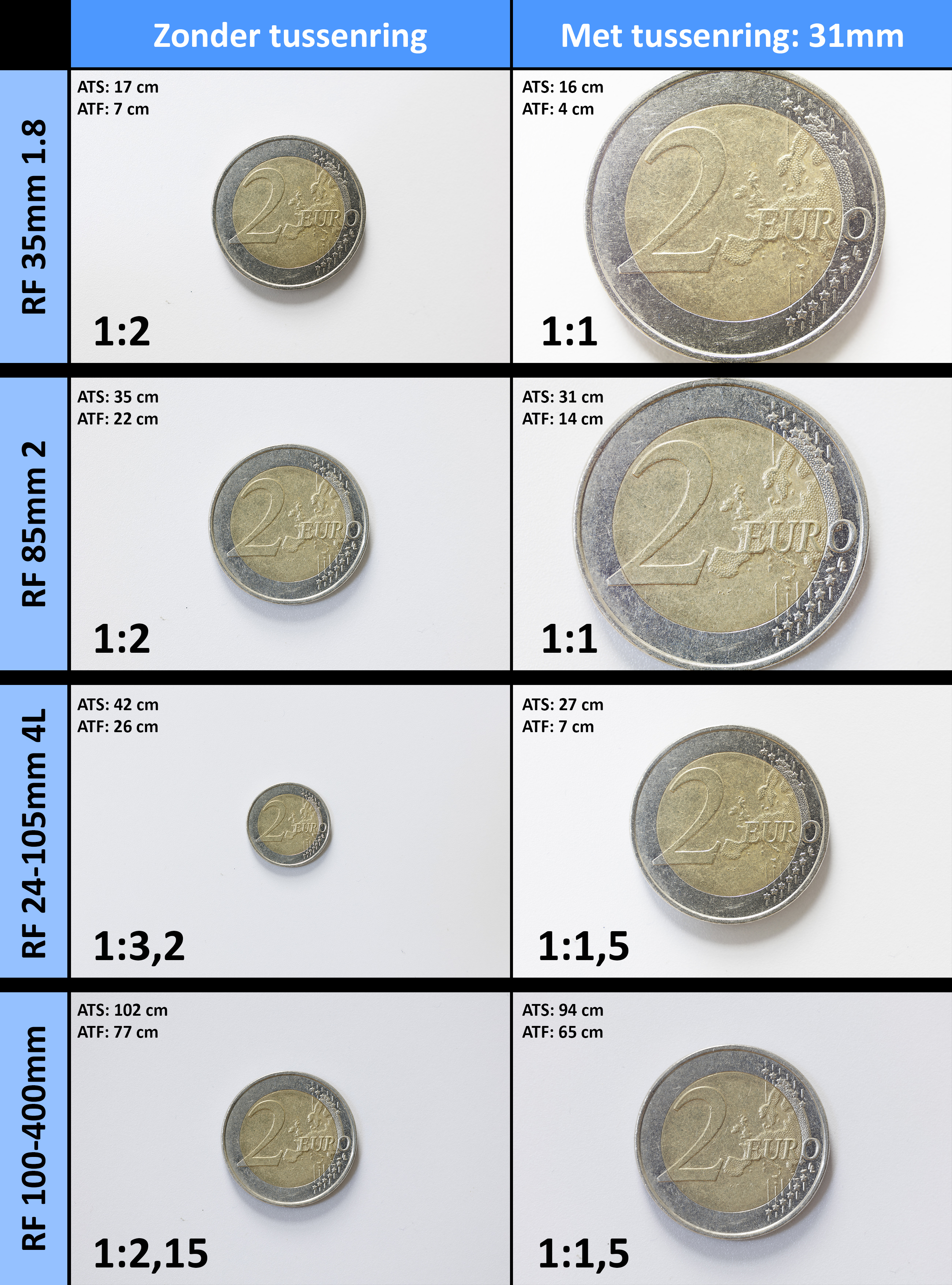 Voor fotografen die regelmatig macro- en close-upfoto’s maken, zijn tussenringen een veel gebruikt accessoire. Je krijgt met een geringe investering op een simpele manier een grotere afbeeldingsmaatstaf (meer vergroting) met bestaande lenzen. Met de komst van de nieuwe RF-vatting van het spiegelloze EOS R-systeem, kun je met RF-lenzen je eventuele EF-tussenringen niet meer gebruiken. Er zijn nu echter RF-tussenringen op de markt (Google: tussenring rf lens) en ik heb even gekeken wat de extra vergroting is op een viertal RF-lenzen.