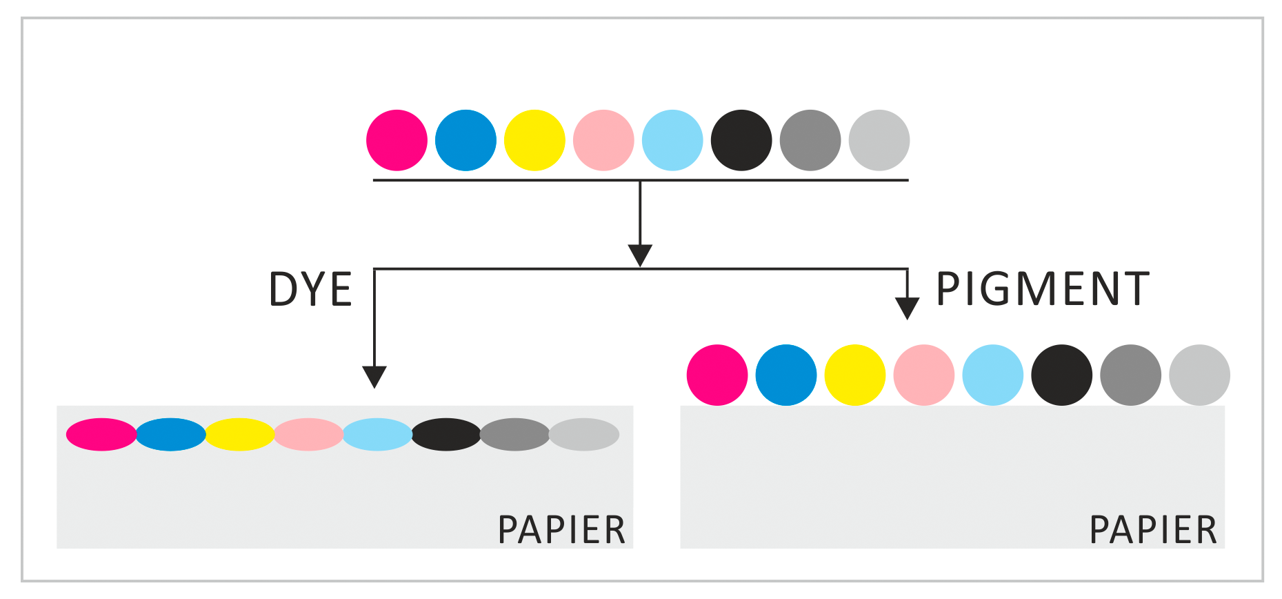 - Pigment-inkt kun je het beste vergelijken met latexverf: vaste kleurdeeltjes die in een vloeistof zweven.