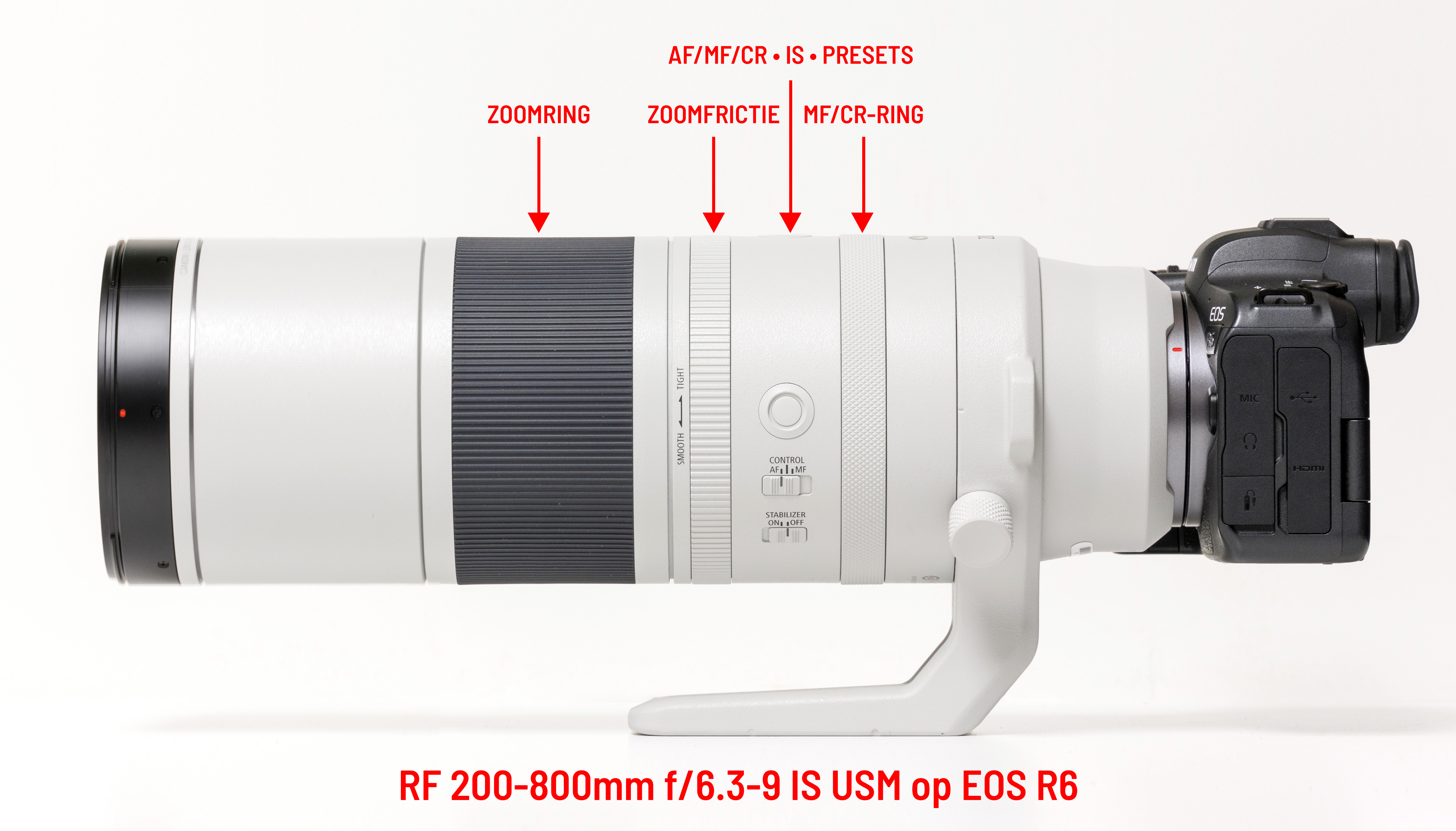 Bij 200mm is de lens 31,5 cm lang en hij schuift uit tot 40,5 cm bij 800mm. De lensbeugel is lang en zit op de juiste plaats, zodat de lens goed in balans blijft als je inzoomt, vooral als de camera wat groter is, dus bij een EOS R3 of een EOS R6/R5 met een batterijgrip. Een monopod kan in sommige gevallen een handig accessoire zijn. De statiefring kan NIET verwijderd worden, maar wel worden verdraaid.