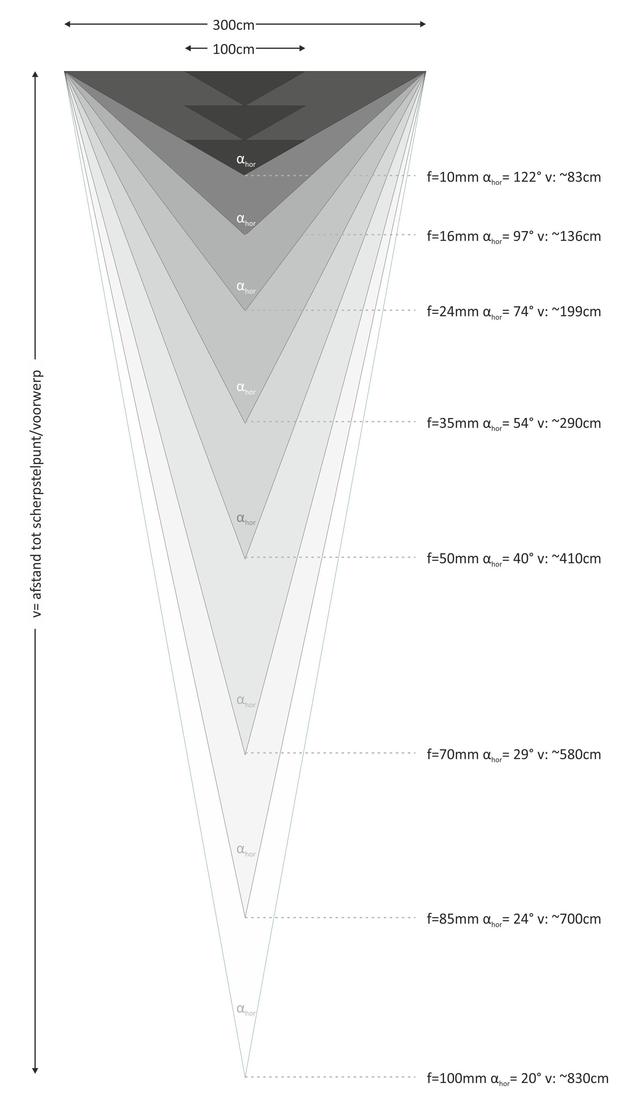 Het verband tussen brandpunt en de horizontale beeldhoek ligt wiskundig vast met onderstaande formule: