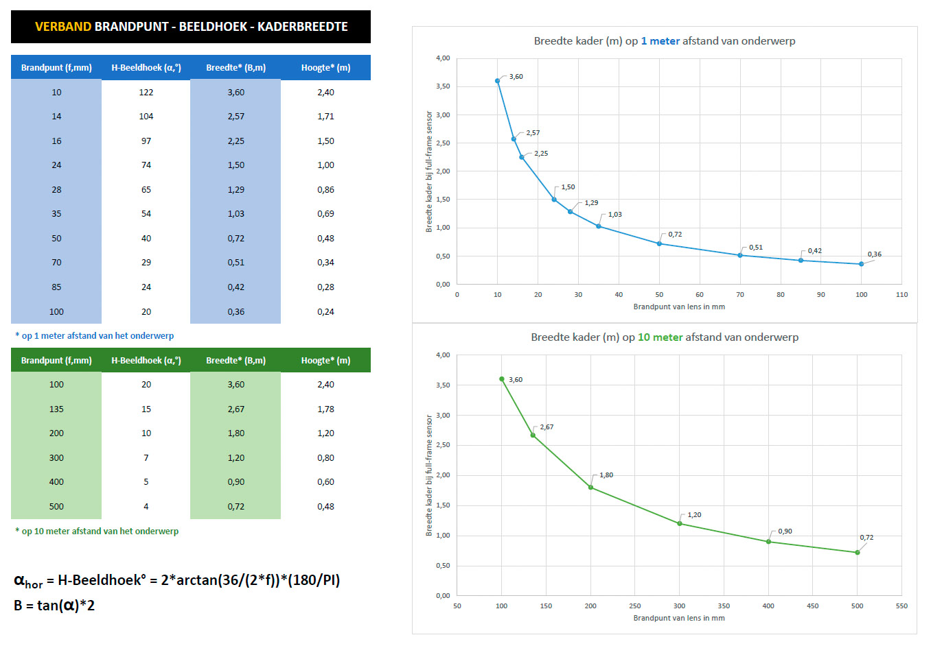 • En als de afstand met een factor 10 toeneemt van bijvoorbeeld 1 meter naar 10 meter, dan wordt de breedte van het kader ook 10x zo groot. Dat zie je bij een brandpunt van 100mm in de onderste rij van de groene tabel (op 1m) en de bovenste rij van de blauwe tabel (op 10m).