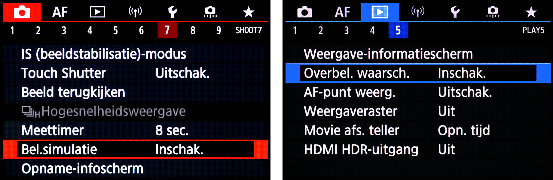 • Als je het lcd-scherm gebruikt als graadmeter voor de belichting (bij spiegelloze camera – MILC – of bij DSLR in Live view), zorg dan wel dat de menu-optie Belichtingssimulatie in de camera geactiveerd is. Kijk hiervoor in de handleiding en let op als je gaat flitsen. Zorg dat bij opname het histogram zichtbaar is op het lcd-scherm of in de EVF en zorg dat bij terugkijken de menu-optie Overbelichtingswaarschuwing ingeschakeld is.