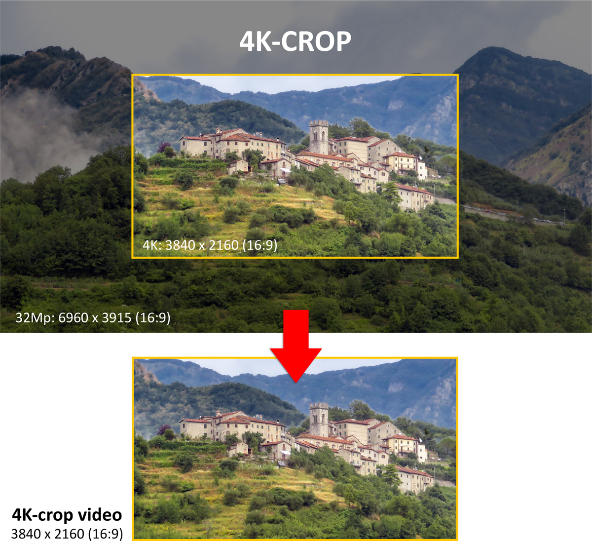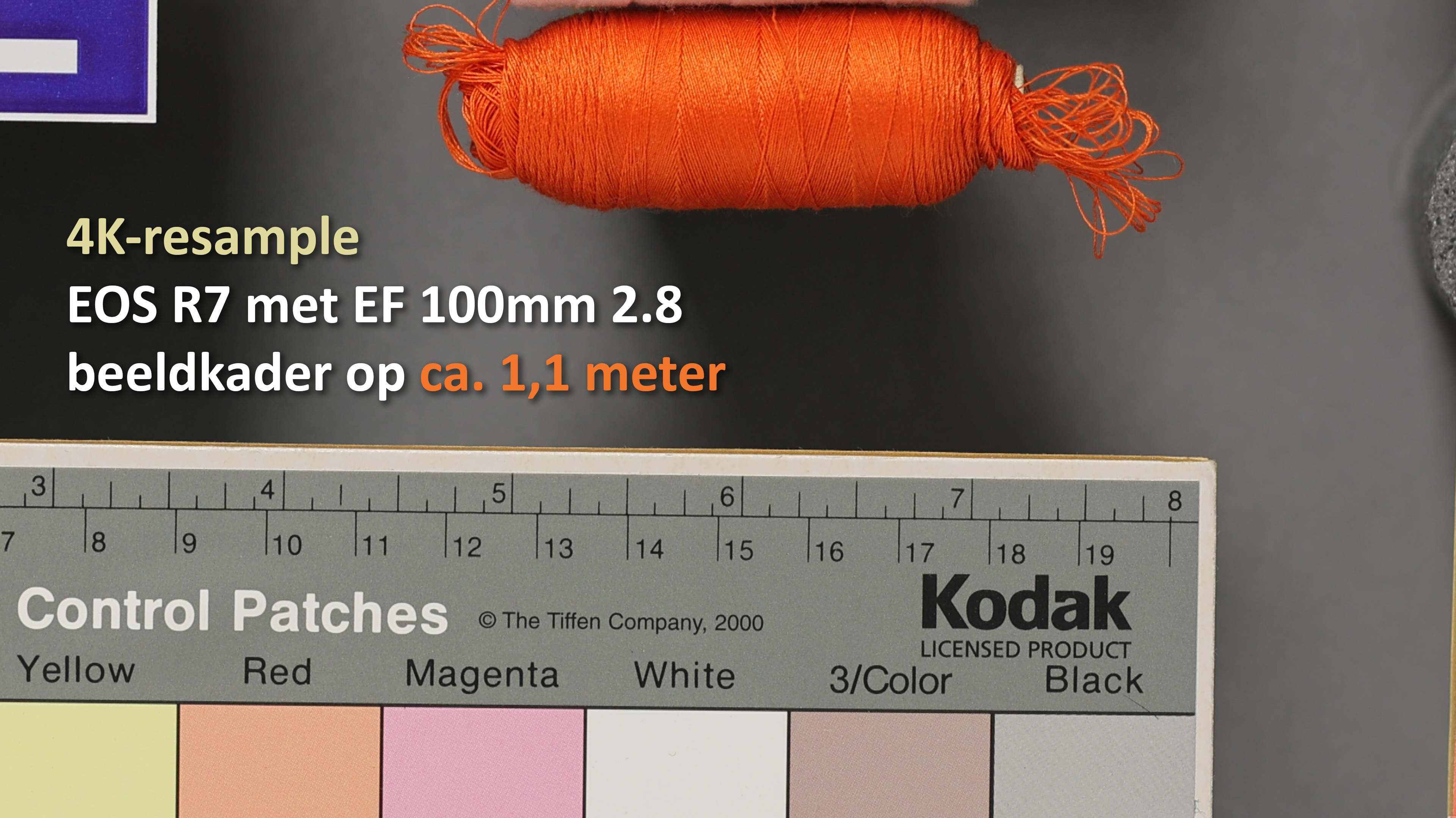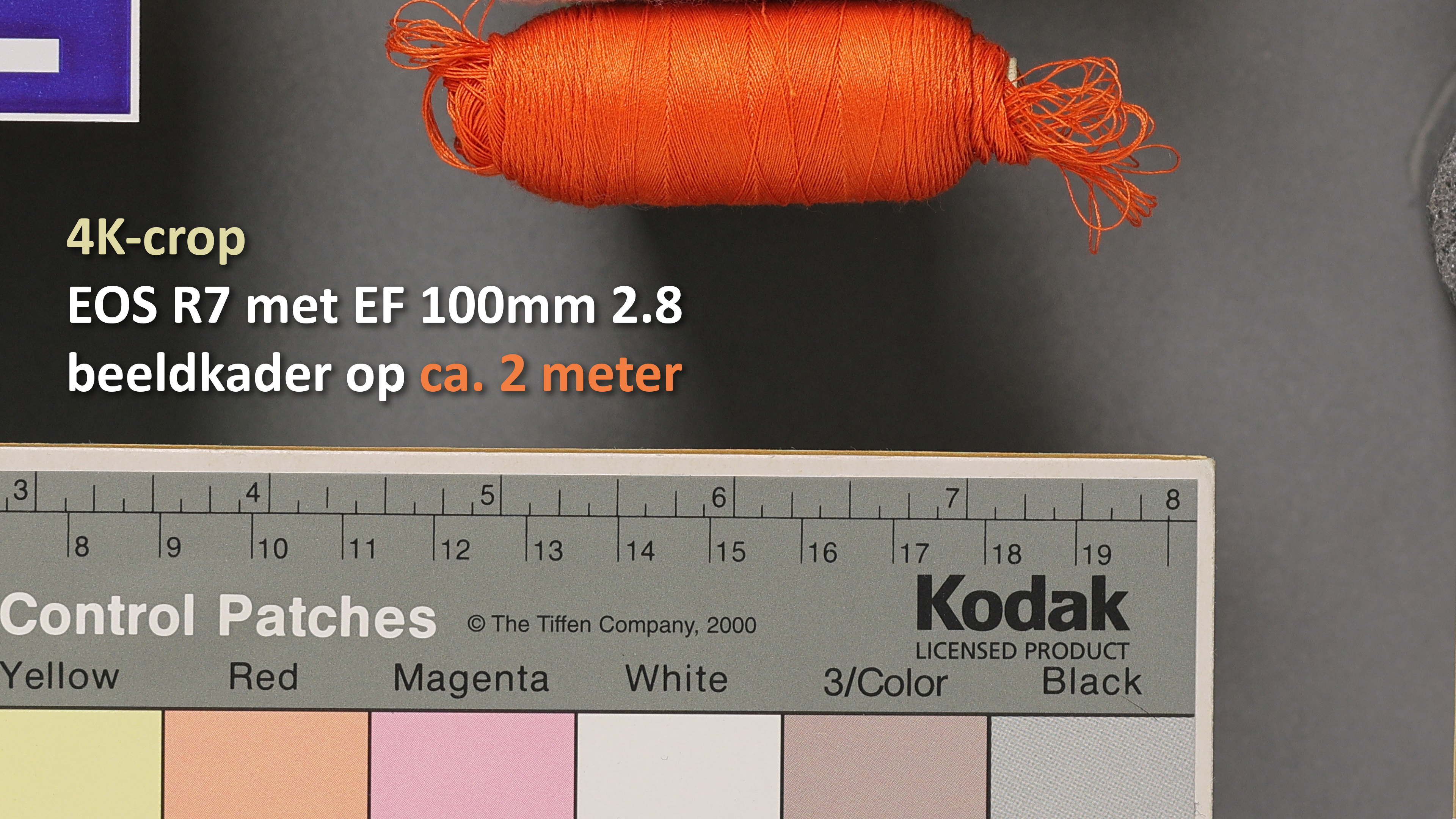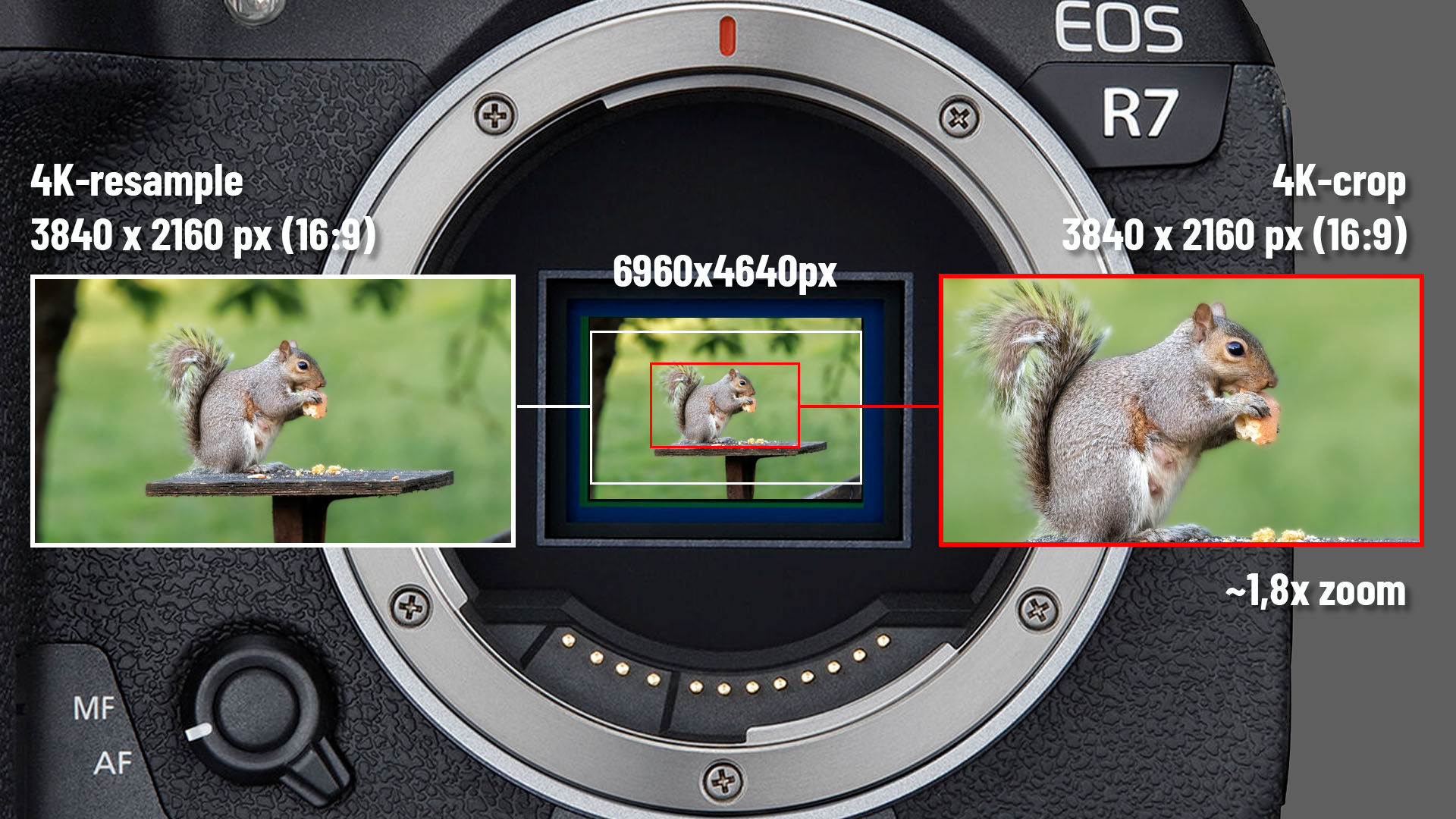 De bovengenoemde 4K-resample is de standaardmodus om met een camera met een hoge resolutie in 4K of Full-HD (1080p) bij gelijkblijvend beeldkader te kunnen filmen. Als je echter in het video-menu van de EOS R7 kijkt, dan zie je daar ook de optie 4K-crop en als je die activeert, dan gebruikt de camera niet de gehele sensor meer als beeldkader, maar alleen het centrum van 3840 x 2160 pixels. Er wordt dus een 1-op-1 uitsnede (crop) gemaakt van 3840 x 2160 pixels uit de oorspronkelijke 6960 x 4640 pixels, zodat de beeldhoek krapper wordt alsof je ingezoomd bent. Er hoeft dan dus niet geresampled te worden.