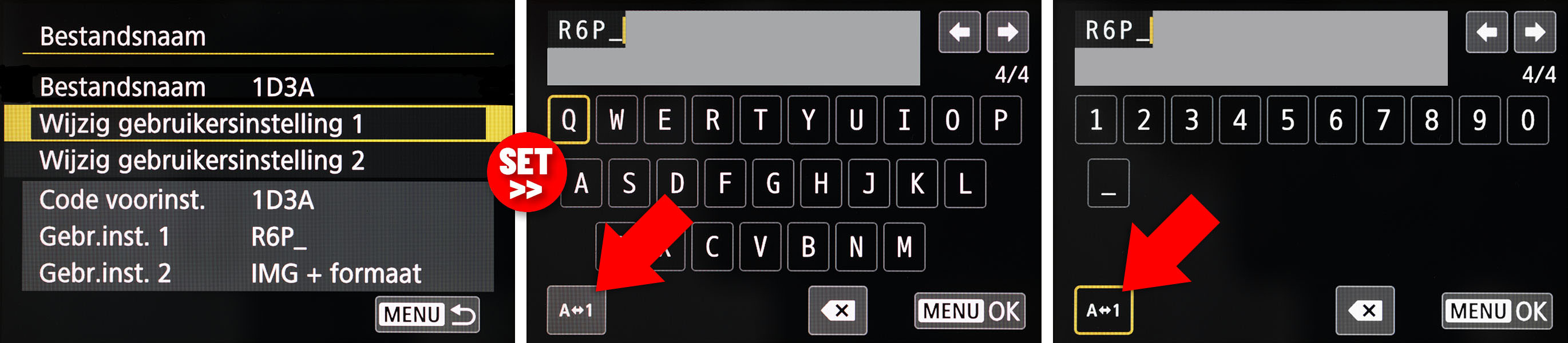 De optie Bestandsnaam vind je op je EOS in het gele hoofdmenu Camera-instellingen, waarschijnlijk onder de eerste tab. De werking is redelijk eenvoudig. Als je de optie Bestandsnaam gekozen hebt en ke drukt op SET, dan zie je de actuele bestandsnaam. Druk je dan weer op SET, dan zie je dat je drie keuzes hebt: