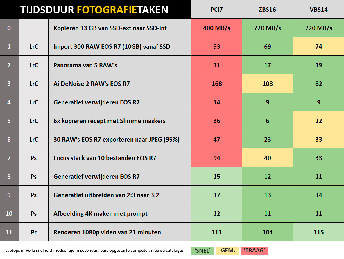 Voor vergelijking van beide laptops met mijn i7 desktop-PC heb ik tien taken in Lightroom Classic en Photoshop gedefinieerd, waarbij ik de tijdsduur (in seconden) van elke taak op de drie machines kan vergelijken.