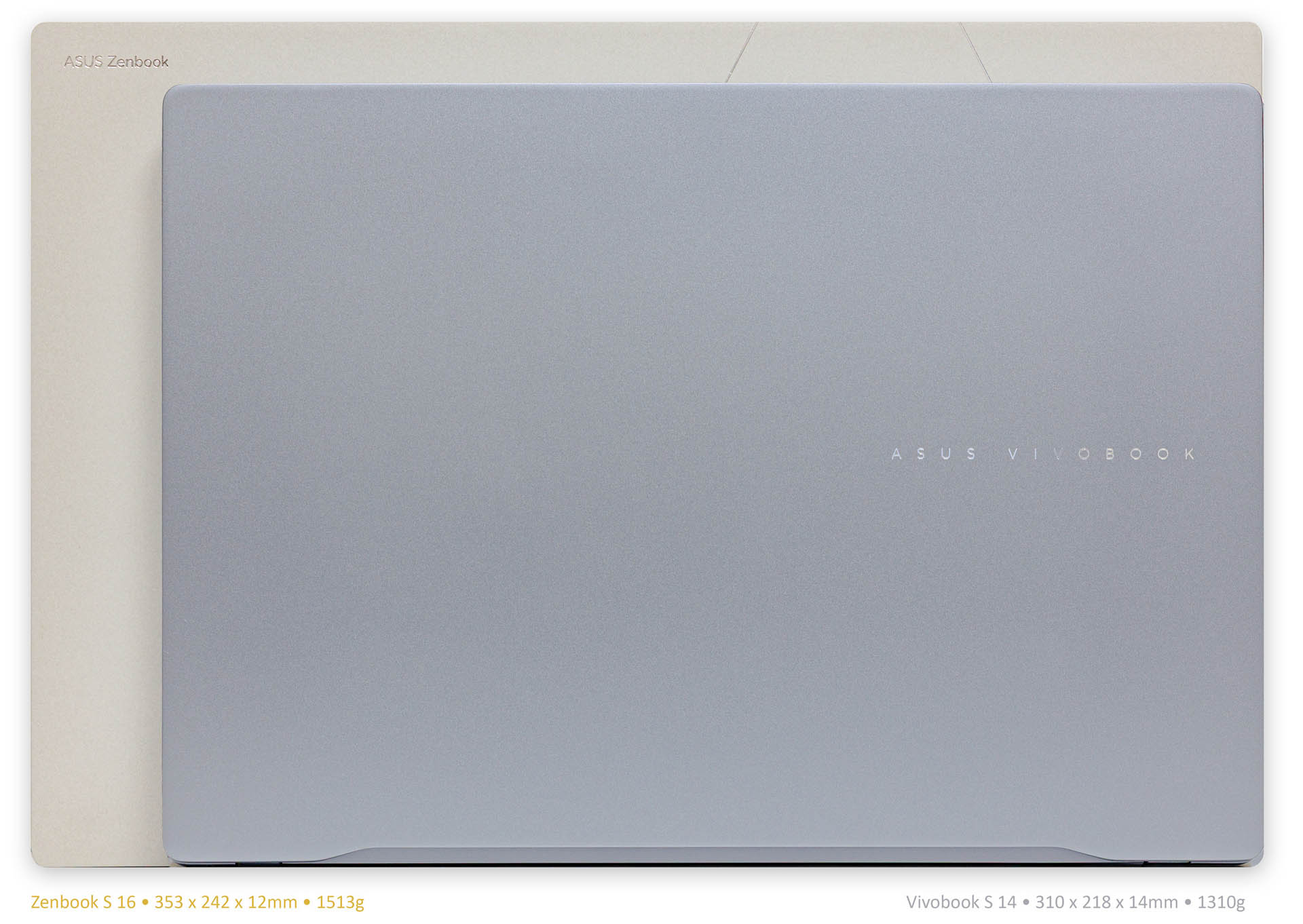 Ten opzichte van de Zenbook S 16 is de Vivobook S 14 duidelijk kleiner en iets lichter. Ideaal voor als je veel op pad bent. Opmerkelijk is dat hij wel 3mm dikker is dan de Zenbook S 16. Het is geen echte eyecatcher zoals zijn grote broer, maar het is wel een fraaie en degelijke aluminium laptop in de kleuren Neutral Black of Mist Blue. De indeling van de binnenzijde is gelijk aan de Zenbook S 16 met een iets kleiner touchpad en geen grill boven de toetsen voor koeling. De poorten zijn iets minder snel dan bij de Zenbook en de interne SD-kaartlezer is vervangen door een micro-SD versie. Toch net wat minder handig als je met een systeemcamera op pad bent. Ook nu ontbreekt de LAN-poort, maar wordt er geen USB-LAN-adapter meegeleverd.