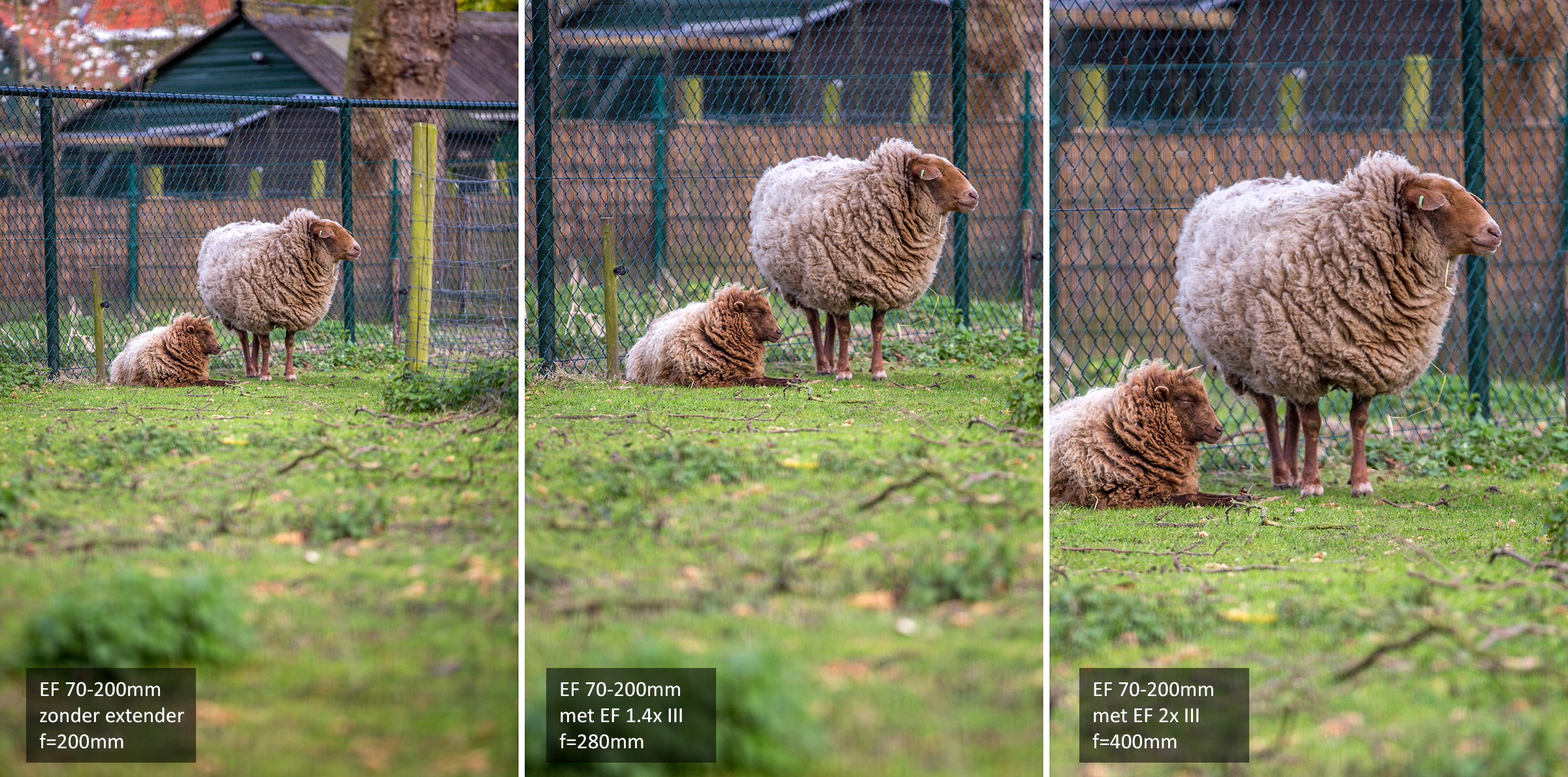 Als je ziet wat een extender voor gevolgen heeft, vraag je je af of je een foto misschien beter achteraf kunt bijsnijden dan meteen ter plekke willen kaderen met een extender. Hieronder hebben we voor drie gevallen de gevolgen van een extender onder elkaar gezet, waarbij de foto’s met de EF 1.4x en zonder extender hebben bijgesneden tot het beeldkader met de EF 2x.