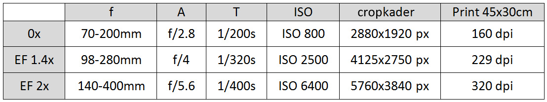 Je ziet dat de ISO behoorlijk oploopt als je bij het weinige licht moet compenseren voor een kleiner diafragma en een kortere sluitertijd. De beeldkwaliteit van de opname zonder extender zal dus beter zijn (veel minder ruis) dan mét extender. Je levert zonder extender echter wel pixels in waarmee het onderwerp beschreven wordt en bij 100% in Photoshop zal de scherpte - ondanks dat er minder ruis te zien is - duidelijk minder zijn dan mét extender. Dat is een hele opluchting, want daar gebruik je een extender juist voor.