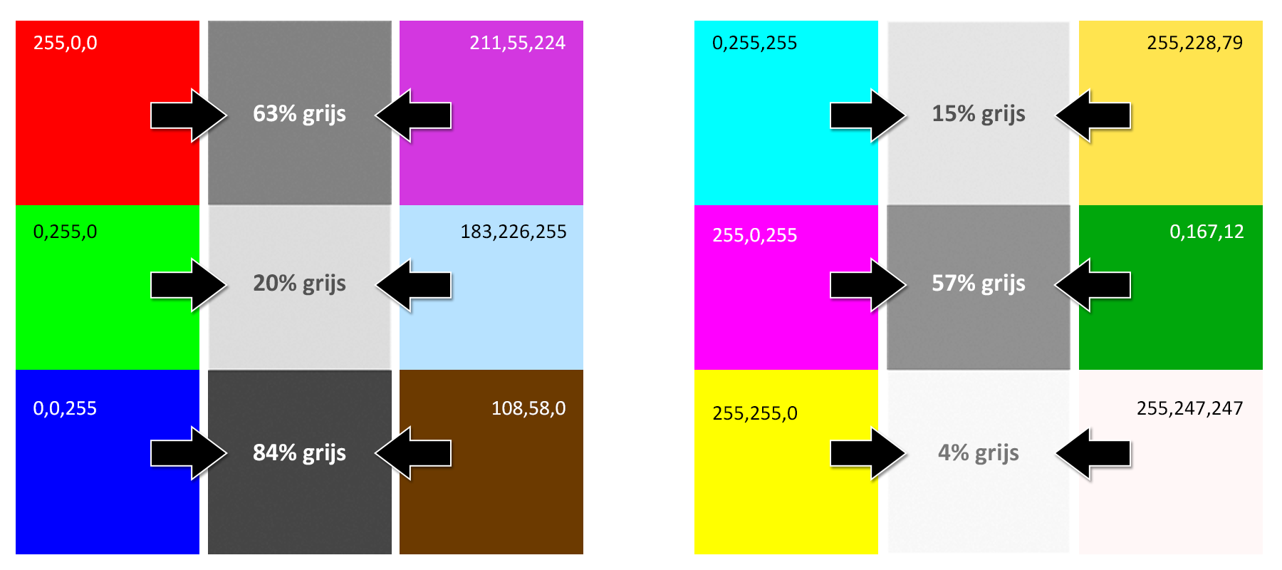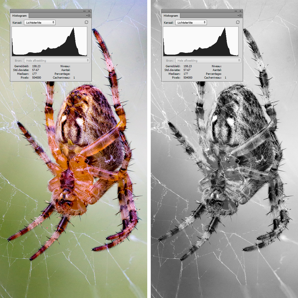 Met een kleurenfoto is het misschien moeilijk te zien wat het helderheidsverschil is tussen bijvoorbeeld rood en groen, maar als je een foto omzet naar ‘zwart-wit’ (modus Grijswaarden), dan wordt die helderheid per kleur meteen duidelijk.