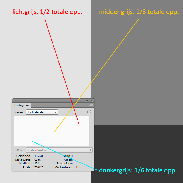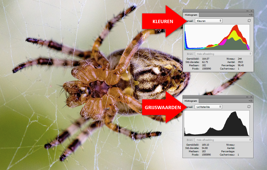 Het histogram is een grafische weergave van de helderheidsverdeling van een foto tussen 100% wit en volledig zwart. Elke pixel van een foto heeft een kleur en de helderheid daarvan komt overeen met een grijswaardepercentage. Een rode pixel (255,0,0) heeft een helderheid van 63% grijs en geel (255,255,0) is veel lichter en komt overeen met 4% grijs. Een fotobewerkingsprogramma, zoals Photoshop, kijkt zo naar de helderheid van alle pixels van een foto en telt deze voor elke helderheid bij elkaar op. Daarbij kunnen dus verschillende kleuren op hetzelfde ‘stapeltje’ komen, zoals blauw (0,0,255) en bruin (108,58,0), die beide 84% grijs vertegenwoordigen.