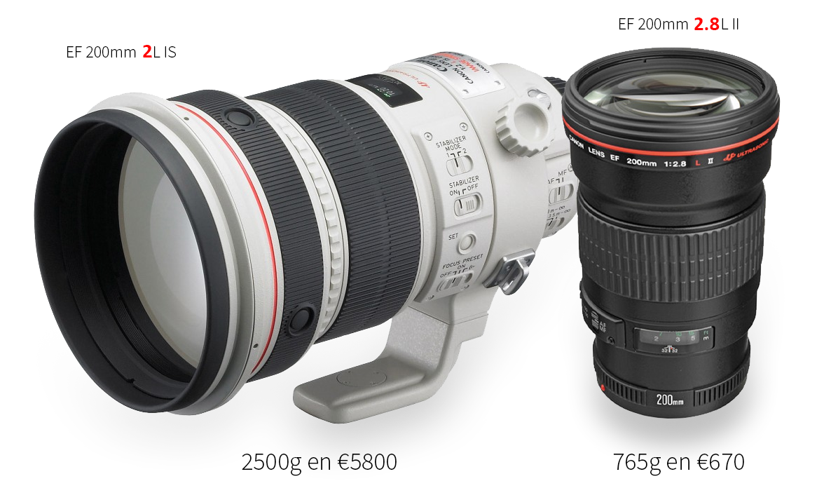 200mm f/2 of f/2.8 Om het verschil in uitvoering en gewicht als gevolg van extra lichtsterkte te verduidelijken, kijken we even naar het verschil tussen de EF 200mm f/2.8 II en zijn grote broertje, de EF 200mm f/2 IS. De f/2.8-versie is 14cm lang en weegt 765g, terwijl de f/2-versie ruim 2500g weegt en ook nog een stuk langer is (21cm). En dat allemaal voor één stopje winst in lichtsterkte én een mooier bokeh. Ook de prijs is een behoorlijk verschil. De EF 200mm 2.8L II kost nog geen 700 euro, terwijl de prijs voor de EF 200mm 2L IS €5800 bedraagt. Toch zal de EF 200mm 2L IS in specifieke gevallen - indoor sport, waarbij één stop het verschil is tussen gelukt (1/125s, scherp) of mislukt (1/60s, bewogen) - toch betere foto’s opleveren. |