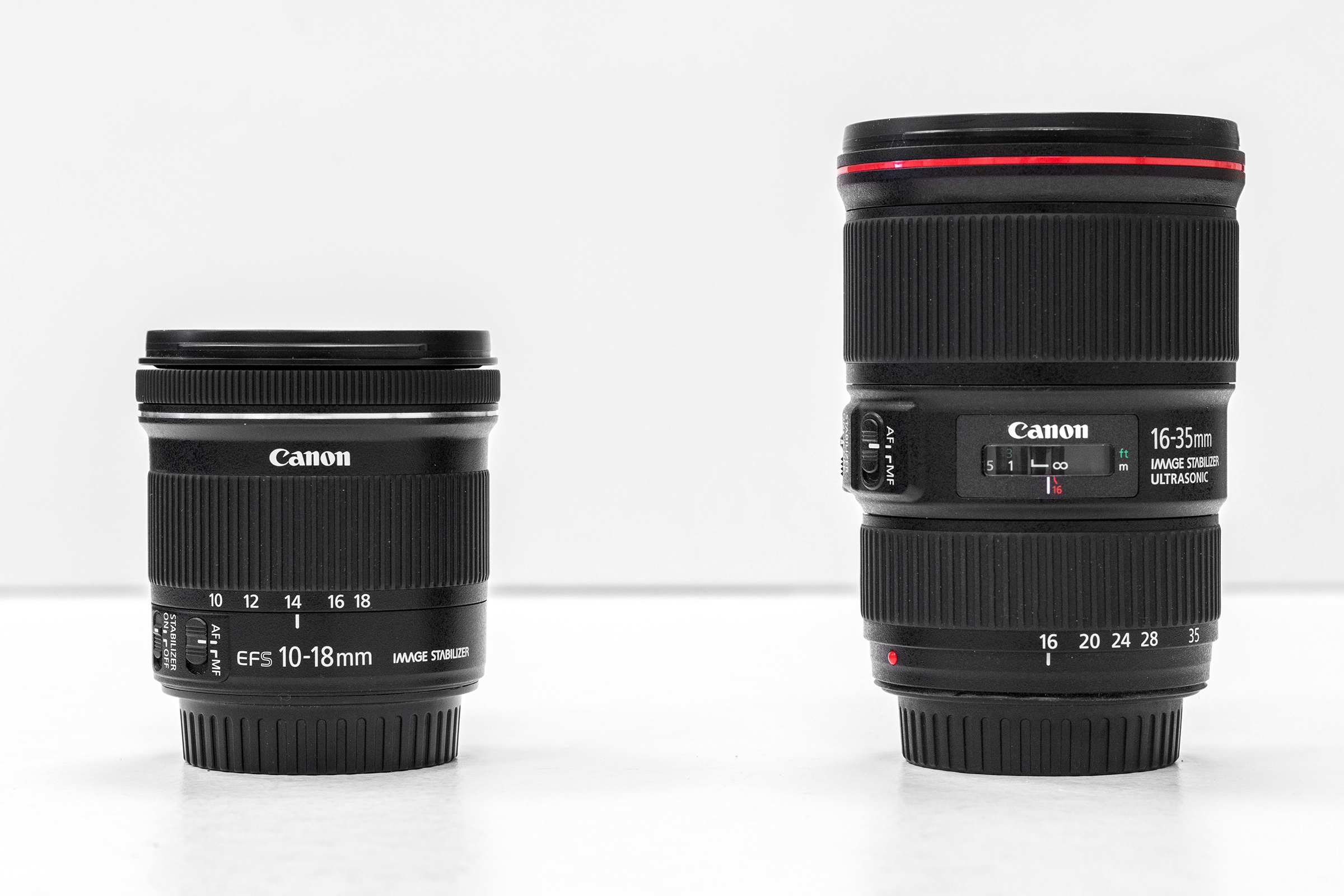 De lenzen zijn ook geheel verschillend. De EF 16-35mm 4L IS is een echt L-objectief, dus duurzame materialen en degelijke afgewerkt. De EF-S 10-18mm 3.5-5.6 IS uiterlijk echt het kleine broertje van de EF 16-35mm en hoewel de uitvoering prima geschikt is voor normaal gebruik, moeten ruwe terrein- en weersomstandigheden vermeden worden, want de lens is toch redelijk fragiel en niet stof- en spatwaterdicht. De respectievelijke filtermaten zijn 77mm en 67mm en dat is beide heel standaard, zodat er een grote keuze aan betaalbare filters (polarisatie, grijsverloop en ND) beschikbaar is voor deze twee lenzen.