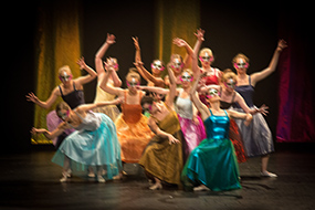 Het podium bij een muziek-, toneel- of dansuitvoering is vaak redelijk goed belicht en dat hebben we nodig voor kortere sluitertijden dan 1/60s, omdat we vanaf grotere afstand verder in moeten zoomen en soms ook beweging moeten bevriezen. Ingezoomd tot 200mm kun je met beeldstabilisatie tot 1/100s bewegingsonscherpte van camera én onderwerp voorkomen en bij f/2,8 werk je dan met ISO’s tussen 1600 en 6400. Werk weer in RAW en AWB. Let op dat het gebied buiten het podium vaak donker is en als je dit meeneemt in de lichtmeting, dan kan het podium overbelicht raken. Werk daarom bij voorkeur met Centrumgewogen gemiddeld. Met het middelste scherpstelpunt heb je de gevoeligste AF en gebruik dit bij rustige dans of andere beweging in combinatie met Ai Focus.
