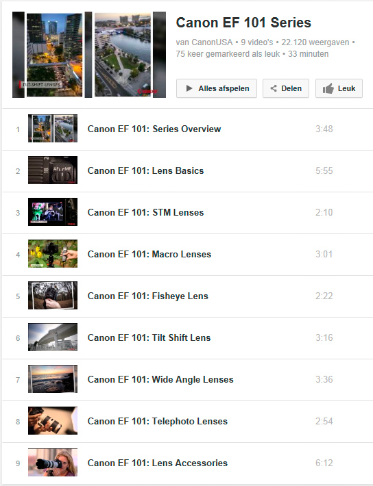 Dus als je de komende vakantie eens aan half uurtje niets te doen hebt, pak dan je tablet en laat je op YouTube alles vertellen over de prachtige objectieven van Canon.